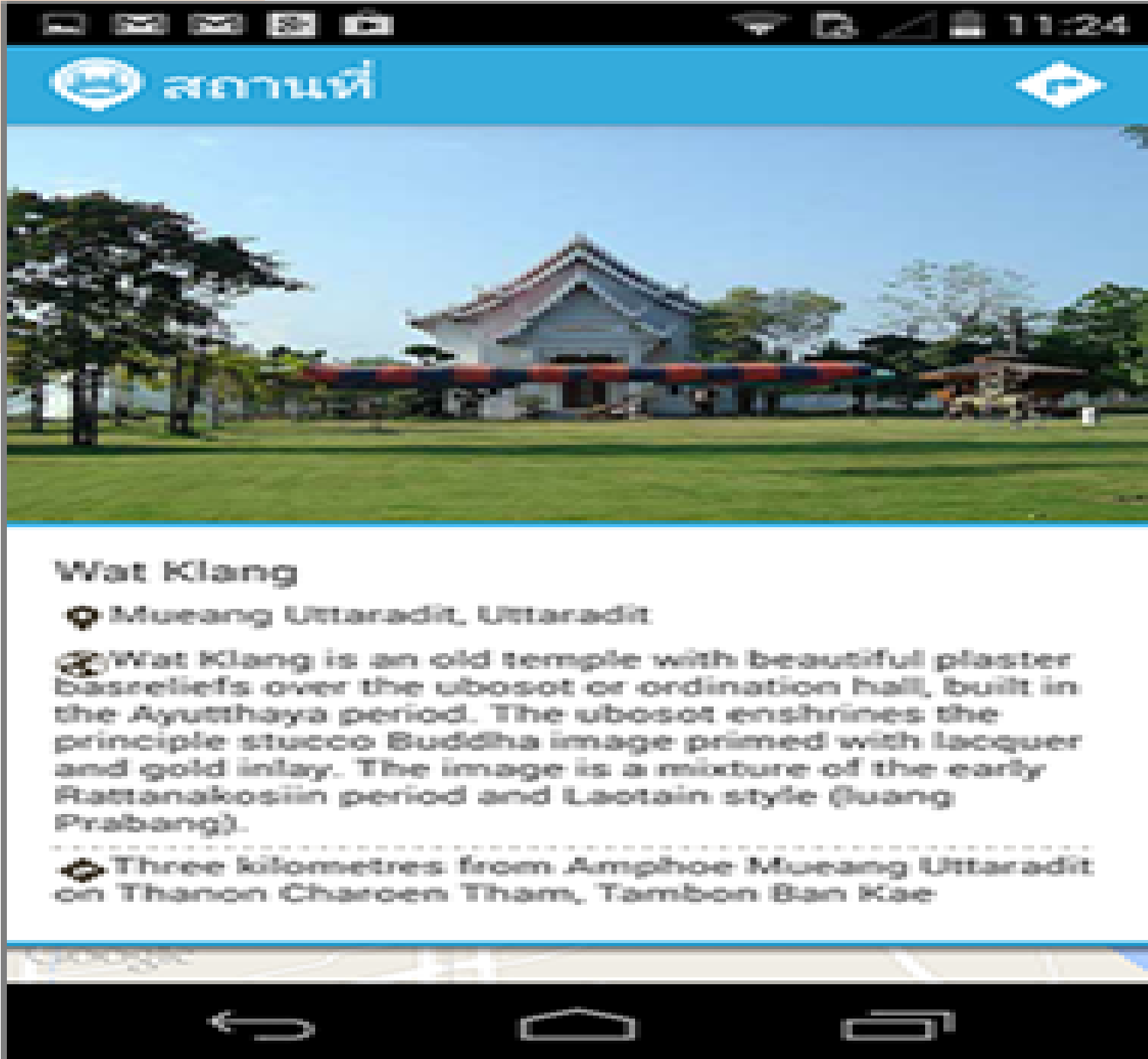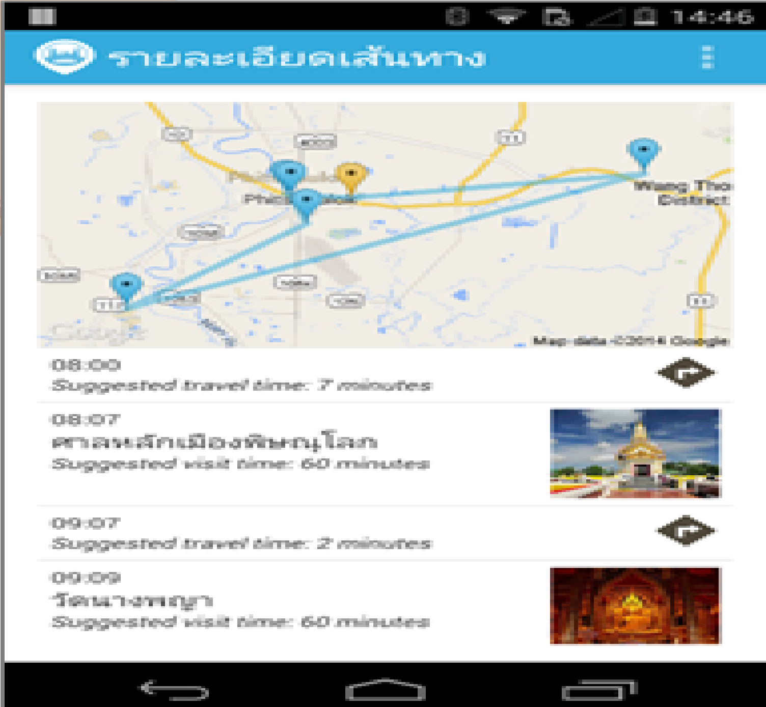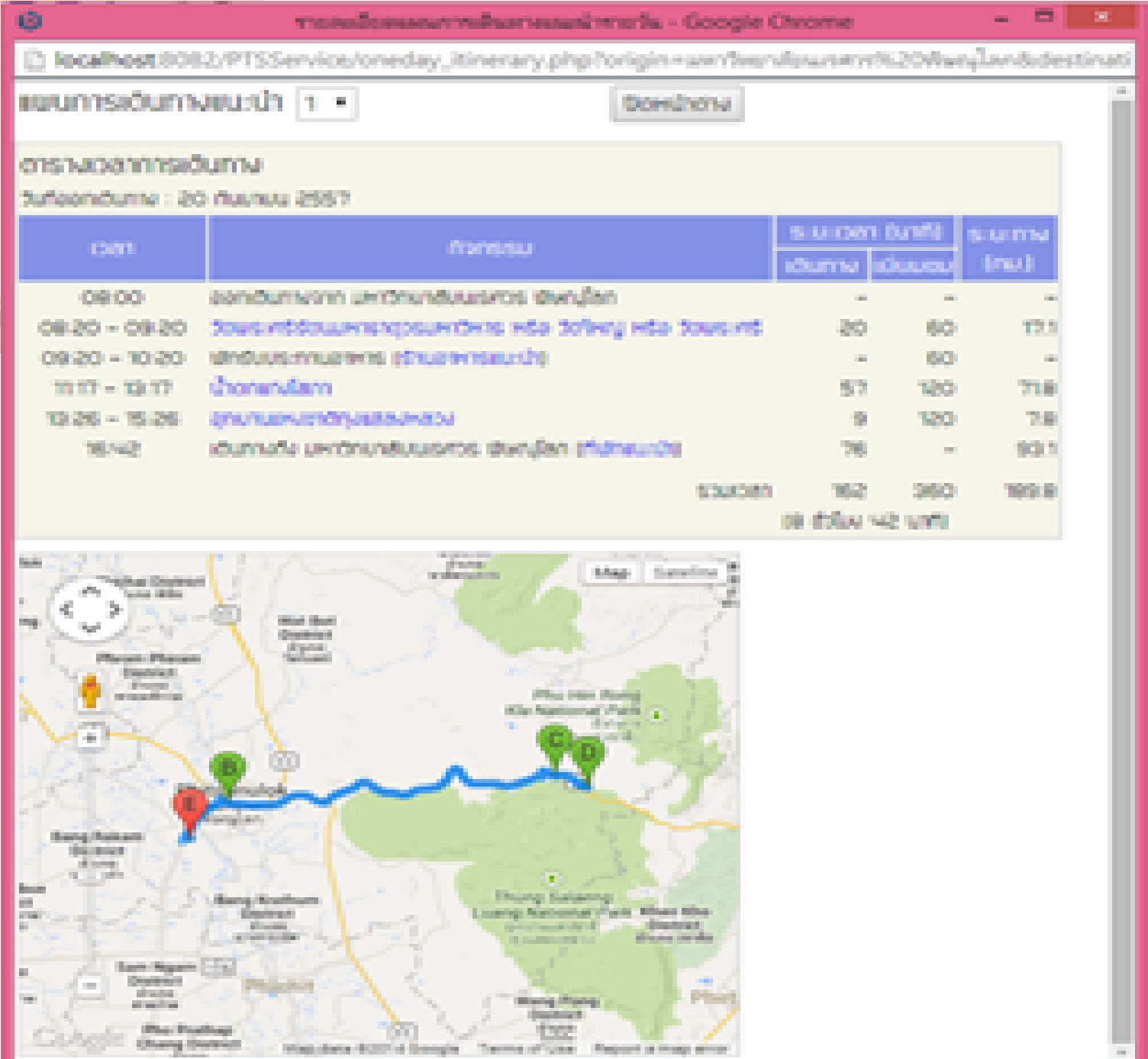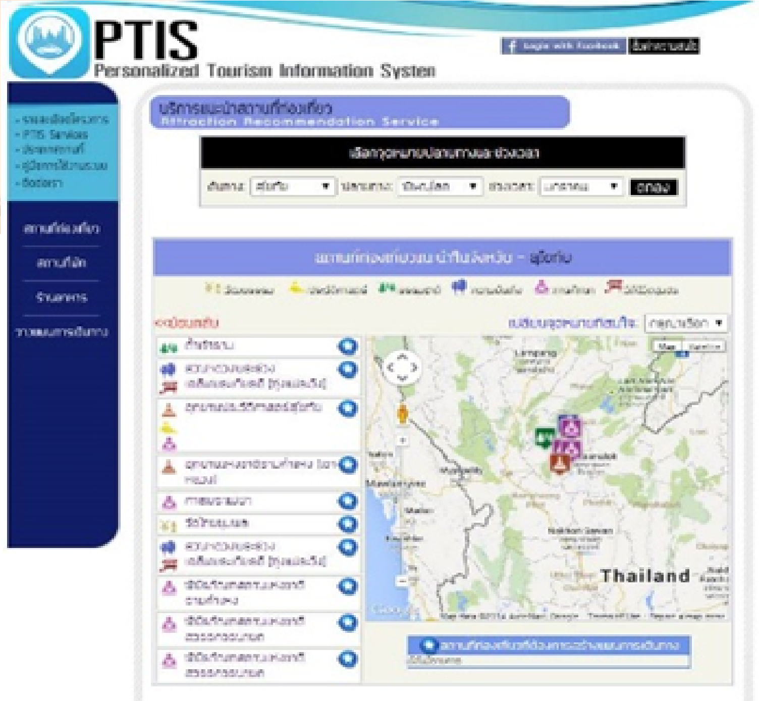 Description ระบบให้บริการข้อมูลการเดินทางเฉพาะบุคคลสำหรับการท่องเที่ยวไทยมีความสามารถในการแนะนำสถานที่ท่องเที่ยวตามความสนใจของผู้ใช้โดยอาศัยข้อมูลจากเครือข่ายสังคมออนไลน์ (เฟสบุ๊ค) และวางแผนการเดินทางอัตโนมัติได้ทั้งแบบวันเดียวและหลายวันตามข้อกำหนดของผู้ใช้โดยนำเสนอเป็นตารางเวลาและเส้นทางการท่องเที่ยว ระบบถูกพัฒนาเป็นเว็บเซอร์วิสซึ่งนักท่องเที่ยวสามารถใช้งานได้ง่ายผ่านเว็บไซต์และแอปพลิเคชันบนอุปกรณ์แอนดรอยด์ ประโยชน์ที่นักท่องเที่ยวและผู้เกี่ยวข้องกับธุรกิจการท่องเที่ยวจะได้รับ คือ ความสะดวกรวดเร็วในการค้นหาสถานที่และวางแผนการเดินทางภายในระบบเดียว