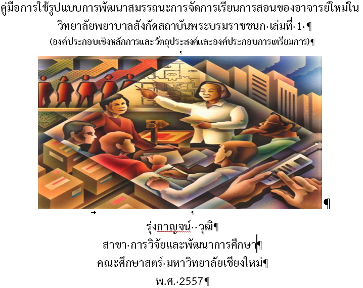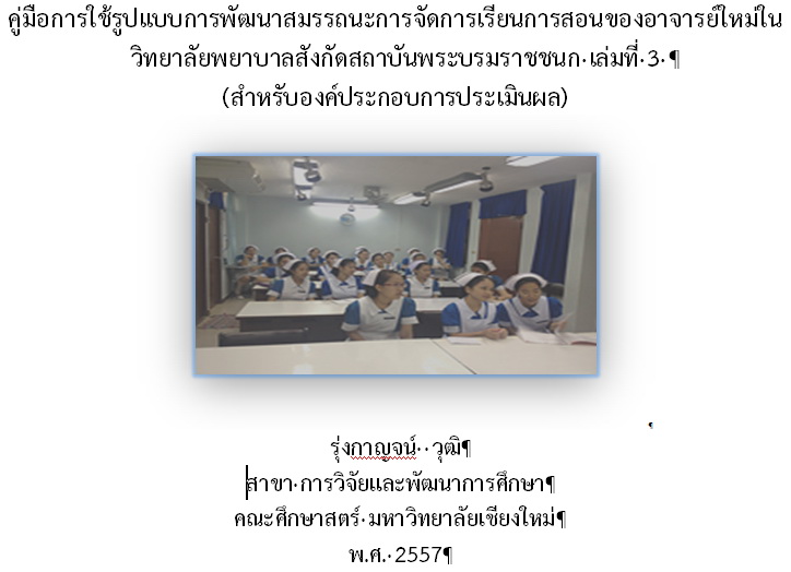 | Title | การพัฒนาสมรรถนะการจัดการเรียนการสอนของอาจารย์ใหม่ในวิทยาลัยพยาบาลสังกัดสถาบันพระบรมราชชนก |