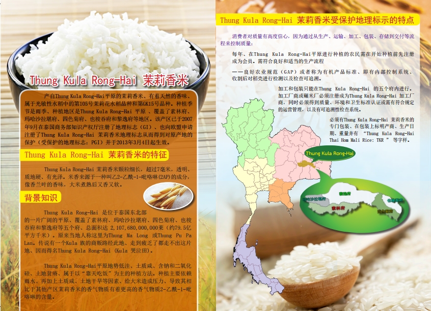 | Description | โครงการพัฒนาต้นแบบการผลิตข้าวหอมมะลิทุ่งกุลาร้องไห้สิ่งบ่งขี้ทางภูมิศาสตร์ด้วยเทคโนโลยีการจัดการ เพื่อเพิ่มคุณภาพความหอมตลอดห่วงโซ่การผลิต มีวัตถุประสงค์ พัฒนาต้นแบบการผลิตข้าวหอมมะลิที่มีคุณภาพสูงเพื่อส่งเสริมและพัฒนาการผลิตข้าวหอมมะลิของเกษตรกรในเขตทุ่งกุลาร้องไห้ พัฒนากระบวนการปลูกด้วยเทคโนโลยีการจัดการความอุดมสมบูรณ์ของดินเพื่อกระตุ้นการสร้างความหอมของข้าวหอมมะลิในช่วงปลูก การสีแปรสภาพด้วยเทคโนโลยีที่ชะลอการสูญเสียความหอม ควบคุมคุณภาพด้วยการยื่นขอการรับรองสินค้าสิ่งบ่งชี้ทางภูมิศาสตร์ ผลผลิตส่งต่อสู่การพัฒนาต้นแบบการส่งเสริมตลาดเฉพาะ (Niche marker) เพื่อใช้เป็นรูปแบบในการพัฒนาการผลิตข้าวหอมมะลิของประเทศไทยให้สามารถเพิ่มศักยภาพทางการตลาดได้อย่างยั่งยืน |