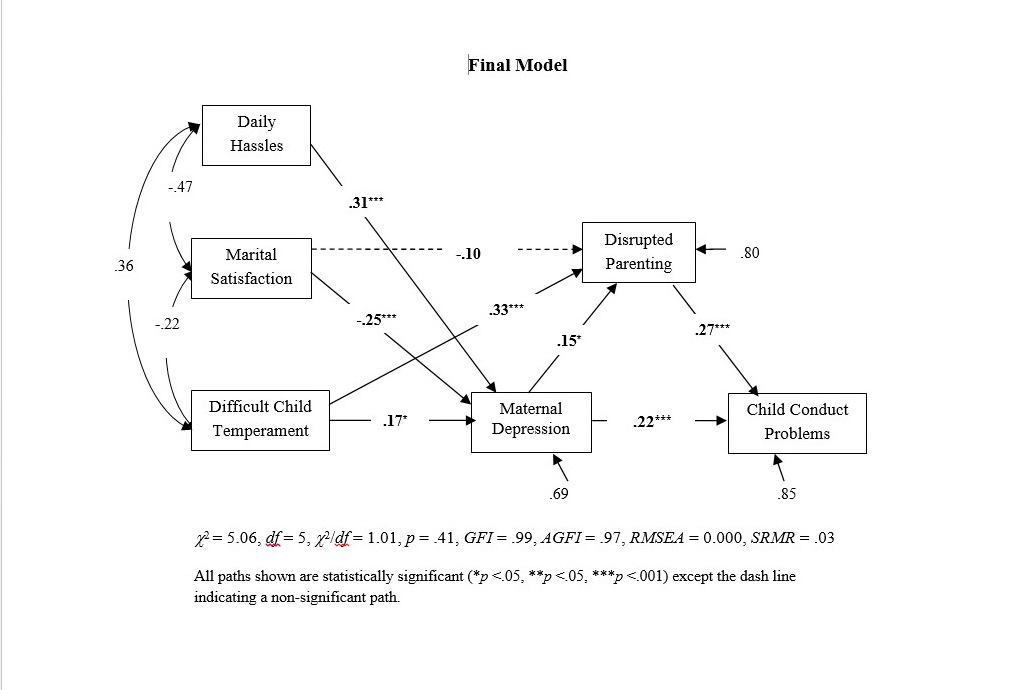 | Description | The purpose of this study was to examine the effects of mothers' stressors, maternal depression and parenting on conduct problems among Thai preschoolers. The participants were mothers of preschoolers with conduct problems (198 mother-child dyads). The data was analyzed by using path analysis. The results showed significant indirect effects of mothers' stressors including daily hassles, marital satisfaction and difficult child temperament on preschoolers' conduct problems. Additionally, both maternal depression and disrupted parenting independently affected child outcome. |
