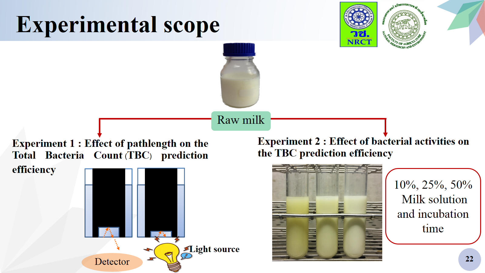 Description ผลการศึกษาการพัฒนาวิธีการตรวจวัดปริมาณเชื้อแบคทีเรียทั้งหมดในน้ำนมโคดิบด้วยเทคนิคเนียร์อินฟราเรดสเปคโตรสโกปี พบว่าการใช้น้ำนมโคดิบผสมอาหารเลี้ยงเชื้อในอัตราส่วน 10% และ 25% บ่มที่อุณหภูมิ 32 องศาเซลเซียส ระยะเวลา 30 นาที ช่วยเพิ่มประสิทธิภาพการทำนายได้ดีกว่าการใช้น้ำนมดิบ 100% และเมื่อนำตัวอย่างน้ำนมโคดิบ 10%, 25% และ 50% ทำการบ่มอุณหภูมิ 32 องศาเซลเซียส ที่ระยะเวลา 30, 60, 90 และ 120 นาที พบว่าผลการทำนายมีความแม่นยำมากขึ้นเมื่อผ่านการจัดการตัวอย่างเป็นน้ำนมโคดิบ 25% ระยะเวลาบ่ม 90 นาที มีค่า R เท่ากับ 0.90 และ ค่า SEP เท่ากับ 0.18 log CFU/ml ดังนั้นการใช้น้ำนมโคดิบผสมอาหารเลี้ยงเชื้อ ช่วยเพิ่มประสิทธิภาพในการทำนายปริมาณแบคทีเรียในน้ำนมโคดิบด้วยเทคนิคเนียร์อินฟราเรดสเปคโตรสโกปี