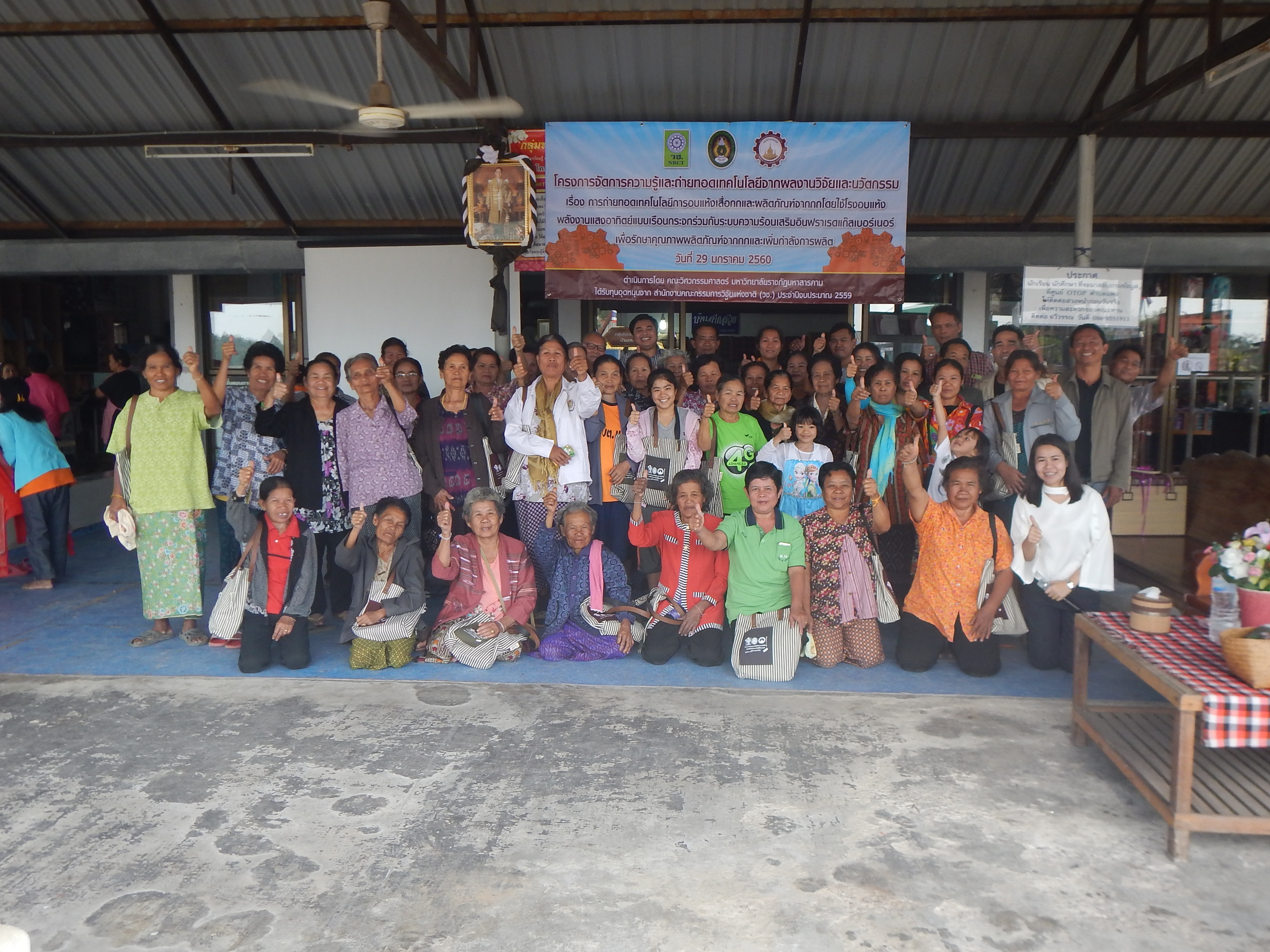 | Description | การถ่ายทอดเทคโนโลยีการอบแห้งเสื่อกกและผลิตภัณฑ์จากกกโดยใช้โรงอบแห้งพลังงานแสงอาทิตย์แบบเรือนกระจกร่วมกับระบบความร้อนเสริมอินฟราเรดแก๊สเบอร์เนอร์เพื่อรักษาคุณภาพผลิตภัณฑ์จากกกและเพิ่มกำลังการผลิต เป็นการใช้องค์ความรู้ที่เกิดจากการค้นคว้าและวิจัย นำมาพัฒนาต่อยอดและขยายผลสู่การใช้ประโยชน์ของชุมชน โดยรูปแบบกิจกรรมเป็นการฝึกอบรมและถ่ายทอดองค์ความรู้ด้านพลังงานแสงอาทิตย์ การประยุกต์ใช้งานด้านการอบแห้ง หลักการทำงานของโรงอบแห้งพลังงานแสงอาทิตย์ฯ ฝึกปฏิบัติใช้งานโรงอบแห้งพลังงานแสงอาทิตย์ฯ ในแต่ละกรณี และการบำรุงรักษาโรงอบแห้งพลังงานแสงอาทิตย์ฯ ให้แก่กลุ่มสตรีดำเนินธุรกิจผลิตภัณฑ์จากกก |