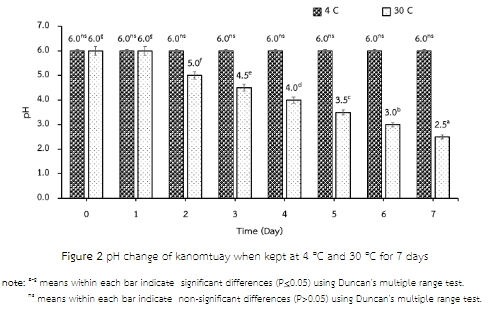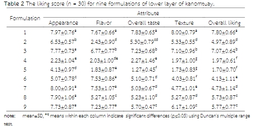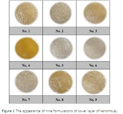| Description | ศึกษาอัตราส่วนที่เหมาะสมของตัวขนมและหน้าขนมถ้วยเพื่อสุขภาพ ทดลองแบบมิกเจอร์ดีไซน์ ส่วนประกอบของน้ำร้อยละ 17.5 น้ำตาลร้อยละ 22.5 และเนื้อลำไยสดร้อยละ 60 ได้รับการยอมรับสูงที่สุด ส่วนอัตราส่วนหน้าขนมถ้วยที่ทดแทนกะทิด้วยนมถั่วเหลืองร้อยละ 50 ผิวหน้าขนมสีเหลืองอ่อน แตกมันปานกลาง เนื้อสัมผัสนิ่ม ไม่มีการแยกชั้นระหว่างผิวหน้าขนมและตัวขนม ผู้ทดสอบยอมรับในระดับปานกลาง การเก็บรักษาที่อุณหภูมิต่ำ 4 องศาเซลเซียส สามารถยืดอายุการเก็บรักษาได้ 7 วัน การเก็บรักษาที่อุณหภูมิ 30 องศาเซลเซียส ขนมถ้วยจะเริ่มเน่าเสียในวันที่ 2 ของการเก็บรักษา ผลิตภัณฑ์ขนมถ้วยเพื่อสุขภาพเป็นทางเลือกหนึ่งที่น่าสนใจสำหรับผู้บริโภค |