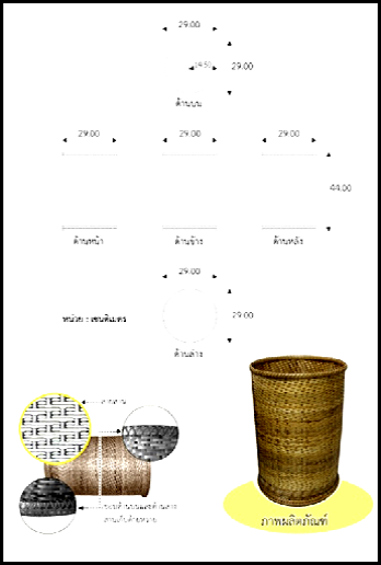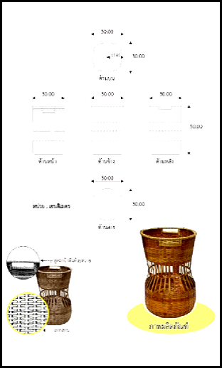 | Description | การออกแบบผลิตภัณฑ์จักสานไม้ไผ่ โดยใช้ภูมิปัญญาท้องถิ่นวิสาหกิจชุมชน กลุ่มหัตถกรรมจักสานพื้นบ้าน บ้านดงชะพลู ตําบลบางมะฝ่อ อําเภอโกรกพระ จังหวัดนครสวรรค์ เพื่อศึกษาผลิตภัณฑ์จักสานไม้ไผ่ วิสาหกิจชุมชนกลุ่มหัตถกรรมจักสานพื้นบ้าน บ้านดงชะพลูตําบลบางมะฝ่อ อําเภอโกรกพระ จังหวัดนครสวรรค์ เพื่อออกแบบผลิตภัณฑ์จักสานไม้ไผ่โดยใช้ภูมิปัญญางานหัตถกรรมจักสานไม้ไผ่และ เพื่อประเมินผลผลิตภัณฑ์จักสานไม้ไผ่ต้นแบบตามเกณฑ์มาตรฐานผลิตภัณฑ์ชุมชนผลิตภัณฑ์จักสานไม้ไผ่ |