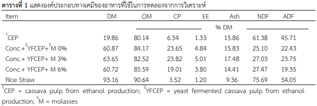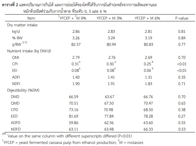 ผลของกากมันสำปะหลังจากการผลิตเอทานอลหมักยีสต์ ร่วมกับกากน้ำตาลต่อปริมาณการกินได้ การย่อยได้ และกระบวนการหมักในกระเพาะรูเมนในโคเนื้อ