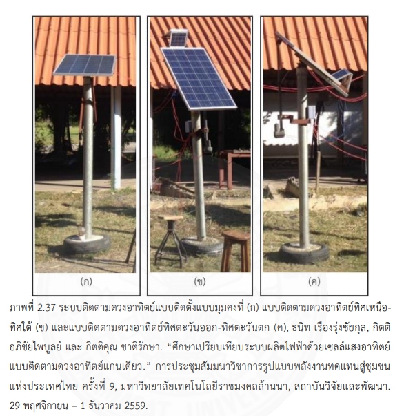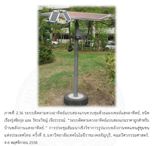 | Description | การติดตั้งแผงเซลล์แสงอาทิตย์เพื่อนำไปใช้งานส่วนใหญ่ยังคงเป็นการติดตั้งแผงเซลล์แสงอาทิตย์แบบมุมคงที่ (Fixed system) ซึ่งเป็นการติดตั้งแผงเซลล์แสงอาทิตย์ที่กำหนดองศาของการติดตั้งแผงเซลล์แสงอาทิตย์ตามองศาเส้นละติจูดของพื้นที่นั้น ๆ และหันแผงเซลล์แสงอาทิตย์เข้าหาเส้นศูนย์สูตรเพื่อรับพลังงานแสงอาทิตย์ได้อย่างมีประสิทธิภาพที่สุด เพราะดวงอาทิตย์มีการเคลื่อนที่ตลอดทั้งวันจากทิศตะวันออกไปสู่ทิศตะวันตก ทำให้การติดตั้งแบบนี้ได้พลังงานสูงสุดในเวลาเที่ยงวันเท่านั้น ส่งผลให้ประสิทธิภาพการใช้งานของแผงเซลล์แสงอาทิตย์ยังมีศักยภาพไม่เต็มที่ ด้วยเหตุนี้นักวิจัยจึงมีการศึกษา ออกแบบ และพัฒนาระบบผลิตไฟฟ้าด้วยเซลล์แสงอาทิตย์แบบติดตามดวงอาทิตย์ (Tracking system) โดยใช้เทคนิค วิธีการที่แตกต่างกัน ซึ่งคาดว่าจะสามารถรับแสงอาทิตย์ได้เพิ่มขึ้นอีกประมาณ 1.3-1.5 เท่า |