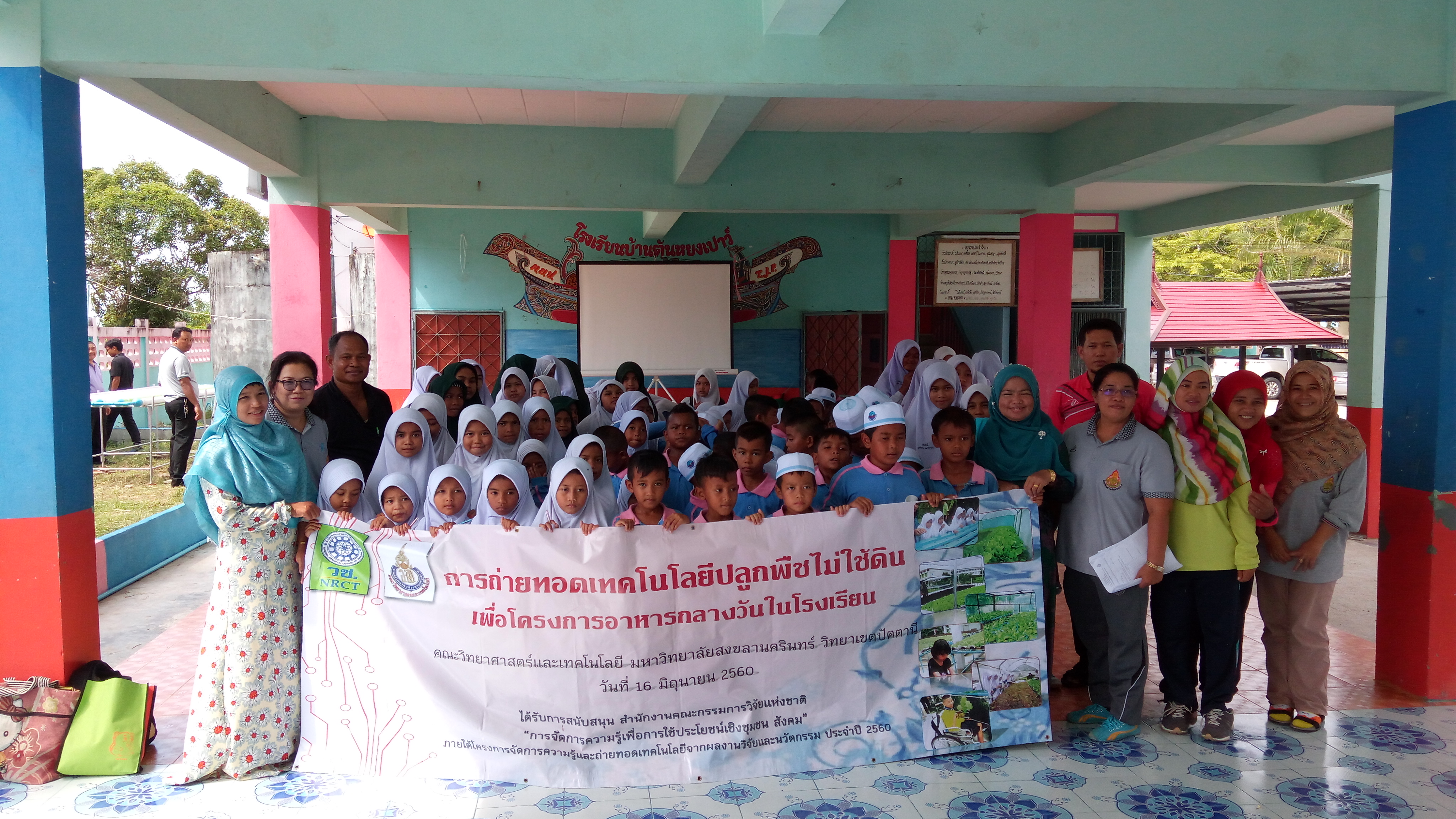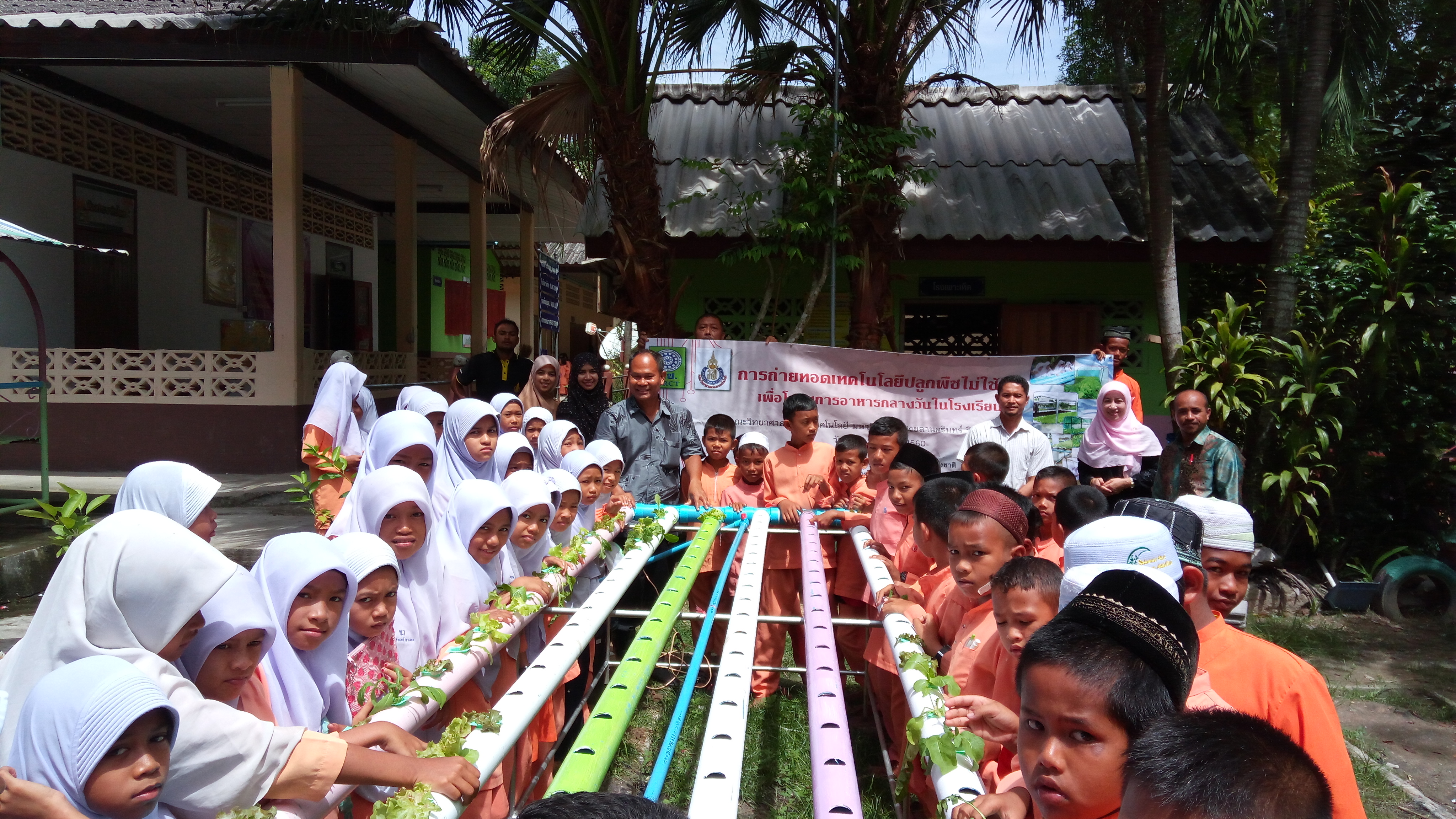 | Description | การถ่ายทอดเทคโนโลยีครั้งนี้นี้มีวัตถุประสงค์เพื่อผลิตวัตถุดิบในการประกอบอาหารในโครงการอาหารกลางวันในโรงเรียนกับโรงเรียนที่เข้าร่วมอบรมสามารถเป็นศูนย์เรียนรู้ทางการเกษตรให้ชุมชนผู้สนใจในจังหวัดชายแดนภาคใต้ สามารถผลิตผักในพื้นที่วิกฤตที่มีสภาพดินไม่เหมาะสม และช่วยให้พึ่งพาตนเองได้ในอนาคตได้ โดยการดำเนินการได้มีการรวบรวมองค์ความรู้การปลูกพืชไม่ใช้ดิน แล้วนำไปถ่ายทอดสู่การปฏิบัติจริงตั้งแต่การฝึกการเตรียมพื้นที่ การติดตั้งชุดปลูกพืชโดยไม่ใช้ดิน การตรวจสอบระบบ การจัดการดูแลรักษาระบบการปลูกพืชไม่ใช้ดิน การเพาะเมล็ด การย้ายกล้าลงบนโต๊ะปลูก และการจัดการให้สารละลายธาตุอาหารในการปลูกโดยไม่ใช้ดิน |
