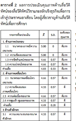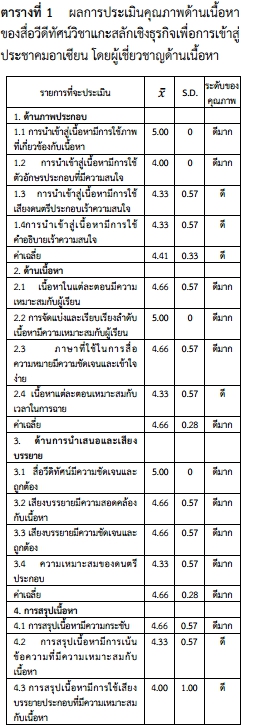 | Keyword | การพัฒนาสื่อวีดิทัศน์, วิชาแกะสลักเชิงธุรกิจ, ประชาคมอาเซียน |