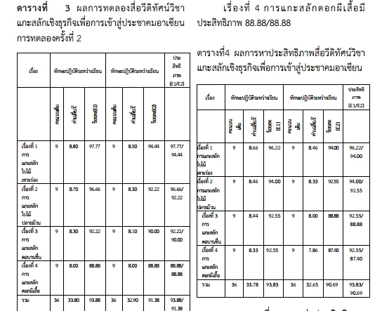 | Description | การพัฒนาสื่อวิดีทัศน์ วิชาแกะสลักเชิงธุกิจเพื่อการเข้าสู่ประชาคมอาเซียน เพื่อพัฒนาสื่อวีดิทัศน์และหาประสิทธิภาพสื่อวีดิทัศน์วิชาแกะสลักเชิงธุกิจเพื่อการเข้าสู่ประชาคมอาเซียนให้มีคุณภาพและประสิทธิภาพตามเกณฑ์ 80/80 และศึกษาความพึงพอใจของนักศึกษาที่มีต่อสื่อวีดิทัศน์วิชาแกะสลักเชิงธุกิจเพื่อการเข้าสู่ประชาคมอาเซียน พบว่า คุณภาพด้านเนื้อหาของสื่อวิดิทัศน์ สื่อคุณภาพสื่อวีดิทัศน์โดยรวมอยู่ในเกณฑ์ดีมาก ประสิทธิภาพของสื่อวีดิทัศน์เป็นไปตามเกณฑ์ที่กำหนดไว้ ส่วนความพึงพอใจอยู่ในระดับดีมาก |