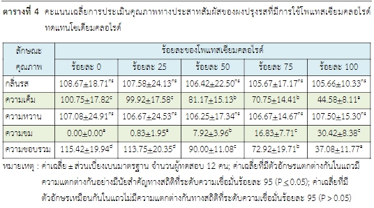 Description ผงปรุงรสเป็นผลิตภัณฑ์ที่มีส่วนผสมของสารสังเคราะห์หลากหลายชนิด ใช้เพื่อปรับปรุงรสชาติของอาหาร การใช้ประโยชน์จากลําไยตกเกรดมาเป็นวัตถุดิบในการผลิตผงปรุงรสเป็นอีกหนึ่งทางเลือกที่น่าสนใจ อัตราส่วนที่เหมาะสม คือ เกลือโซเดียมคลอไรด์ น้ำตาล และลําไยผง ร้อยละ 25, 35 และ 40 ตามลำดับ การทดแทนเกลือโซเดียมคลอไรด์ด้วยโพแทสเซียมคลอไรด์ พบว่า การเพิ่มปริมาณโพแทสเซียมคลอไรด์ ส่งผลต่อความเค็ม ความขม และความชอบรวมของผู้บริโภค แต่ไม่ส่งผลต่อกลิ่นรสรวมและความหวาน (p>0.05) การใช้โพแทสเซียมคลอไรด์ทดแทนโซเดียมคลอไรด์ คือ ร้อยละ 25 มีคะแนนความชอบรวมสูง สูตรการผลิตผงปรุงรสจากลําไยตกเกรด คือ เนื้อลําไยผง น้ำตาล โซเดียมคลอไรด์ โพแทสเซียมคลอไรด์ เนื้อปลาผง พริกไทยผง และกระเทียมผง ร้อยละ 32, 28, 15, 5, 16, 2, และ 2 ตามลําดับ