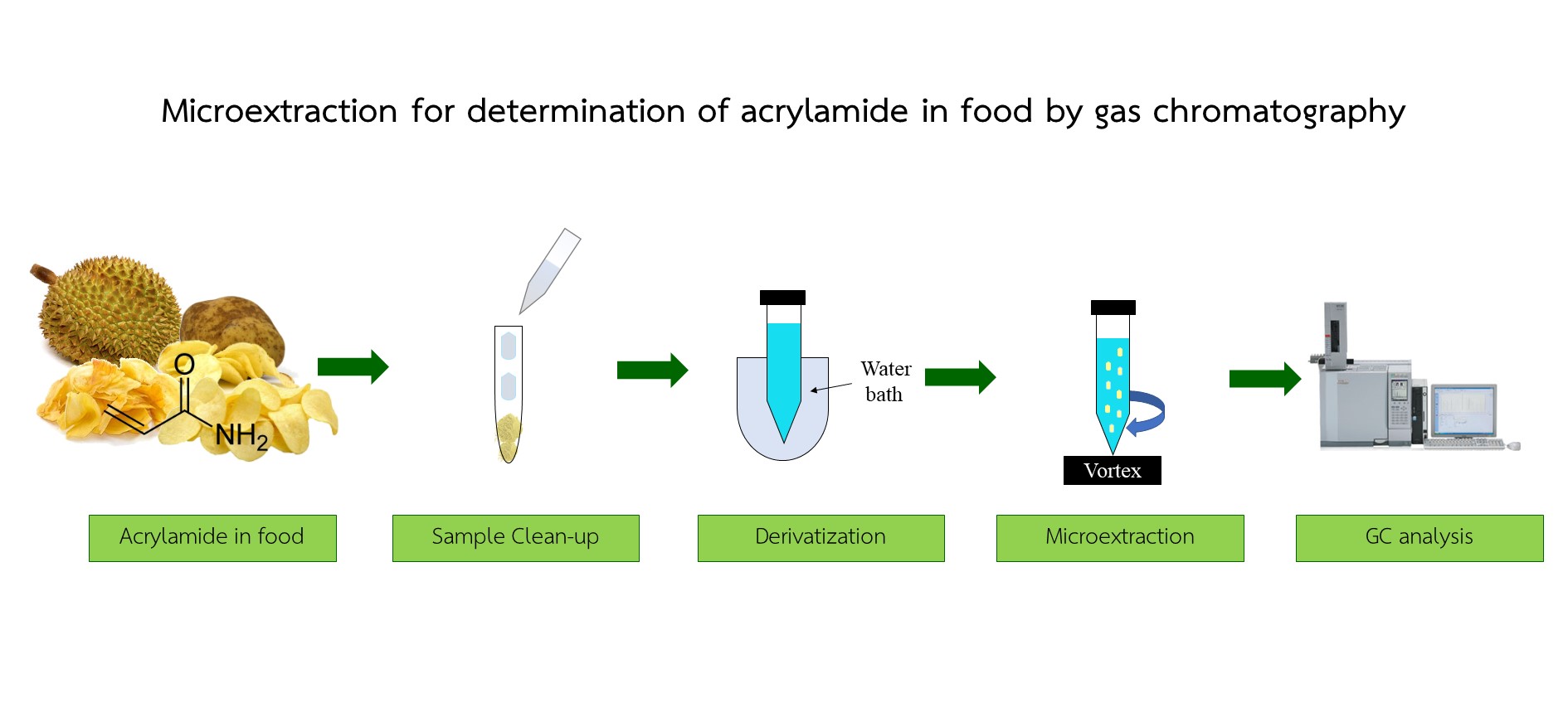 Description อาหารทอดและขนมกรุบกรอบที่มีกระบวนการแปรรูปหรือปรุงอาหารโดยใช้ความร้อนสูง จะมีสารพิษที่เป็นอันตรายต่อสุขภาพ ส่งผลให้เกิดภาวการณ์เป็นมะเร็งสูง นั่นก็คือ อะคริลาไมด์ นอกจากกระบวนการผลิตอาหารแล้ว อะคริลาไมด์ยังสามารถปนเปื้อนสู่น้ำได้ ดังนั้นวิธีการหาปริมาณอะคริลาไมด์จึงถูกพัฒนาขึ้นโดยอาศัยเทคนิคแก๊สโครมาโทกราฟี-เฟรมไอออนไนเซซัน (Gas Chromatography – Flame Ionization Detection, GC-FID) และแก๊สโครมาโทกราฟี-แมสสเปคโทรเมทรี (Gas Chromatography – Mass spectrometry, GC-MS) โดยการเตรียมอนุพันธ์และการสกัดระดับไมโครลิตรด้วยของเหลวแบบกระจายได้ถูกนำเสนอเพื่อช่วยเพิ่มความไวในการตรวจวัดอะคริลาไมด์