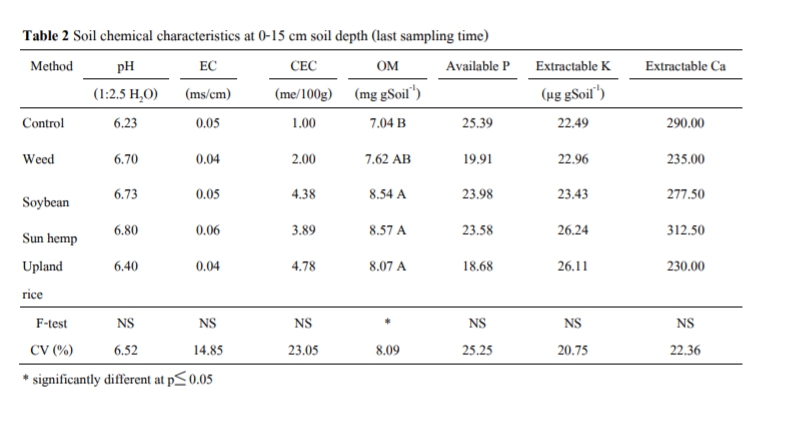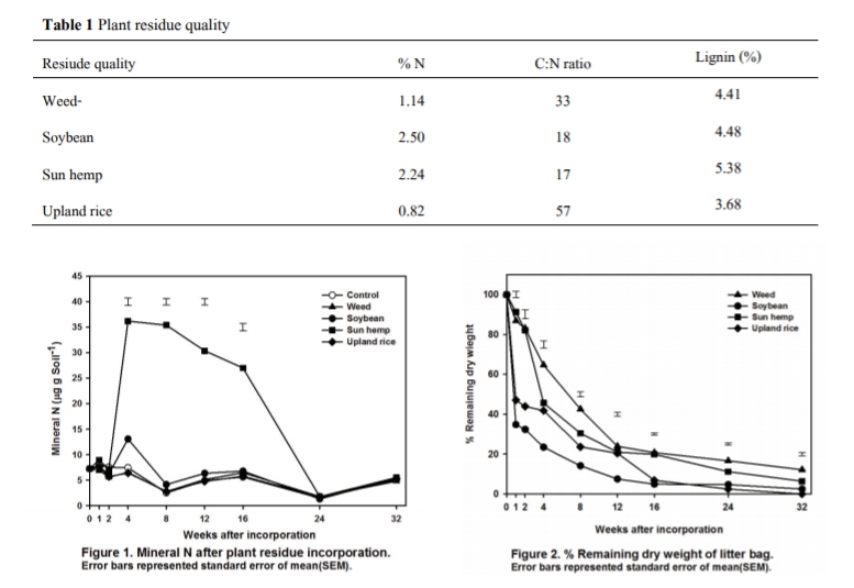 | Description | วัตถุประสงค์เพื่อศึกษาการย่อยสลายและการเปลี่ยนแปลงอนินทรีย์ไนโตรเจนในดิน ที่มีการไถกลบเศษซากข้าวไร่และพืชตระกูลถั่ว วางแผนงานทดลองแบบ Randomized Complete Block Design (RCBD) 4 ซ้ำ การทดลองประกอบขึ้นด้วย 5 กรรมวิธีทดลอง ได้แก่ 1) ไม่ไถกลบเศษซากพืช, 2) ไถกลบวัชพืช, 3) ไถกลบซากถั่วเหลือง, 4) ไถกลบซากปอเทือง, 5) ไถกลบซากข้าวไร่ ทำการเก็บตัวอย่างดินและ litter bag ที่ระยะ 1, 2, 4, 8, 12, 16, 24 และ 32 สัปดาห์หลังการไถกลบ เพื่อวิเคราะห์หาอนินทรีย์ไนโตรเจนในดิน (soil mineral N) โดยใช้เครื่อง Flow Injection Analyzer (FIA) และน้ำหนักแห้งคงเหลือของ litter bag และวิเคราะห์หาคุณสมบัติทางเคมีของดินหลังการทดลอง ผลการศึกษาพบว่า กรรมวิธีไถกลบซากปอเทืองนั้นส่งผลให้ดินมีปริมาณอนินทรีย์ไนโตรเจนสูงที่สุดอย่างมีนัยสำคัญทางสถิติ (P ≤ 0.05) ที่ 4, 8, 12 และ 16 สัปดาห์หลังการไถกลบ เปอร์เซ็นต์น้ำหนักแห้งคงเหลือ (% remaining dry weight) ของ litter bag แตกต่างกันทางสถิติ (P ≤ 0.05) ทุกครั้งที่มีการเก็บข้อมูล ซากวัชพืชมีการย่อยสลายช้าที่สุด ในขณะที่ซากถั่วเหลืองมีการย่อยสลายเร็วที่สุด |
