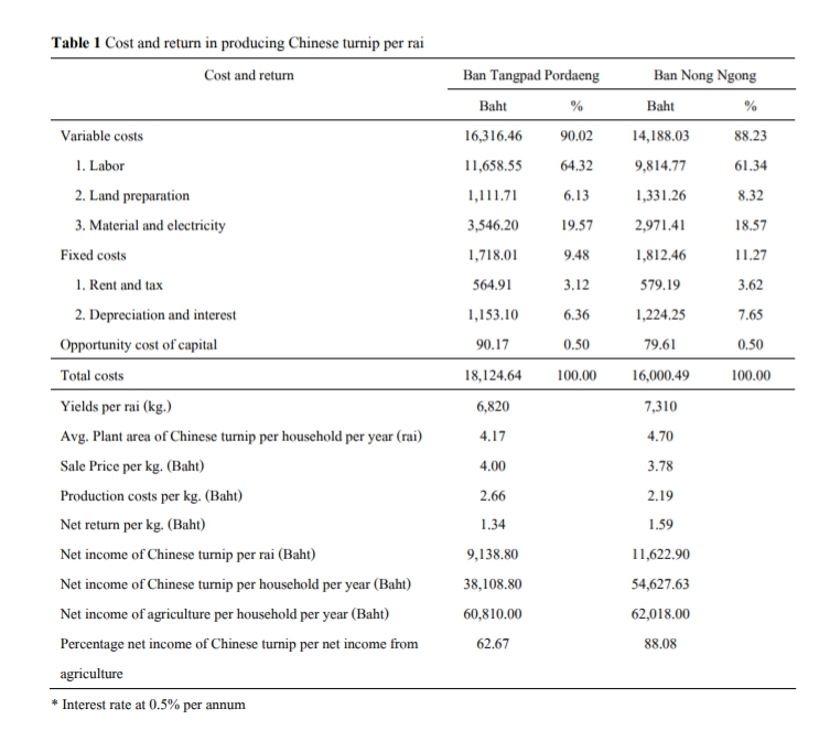 | Description | วัตถุประสงค์เพื่อศึกษาการจัดการการผลิตและการตลาดของเกษตรกรผู้ปลูกผักกาดหัวในฤดูแล้ง โดยใช้แบบสำรวจและเยี่ยมแปลงเกษตรกร 61 ราย และสัมภาษณ์พ่อค้าคนกลาง 1 ราย ในพื้นที่หมู่บ้านหนองโง้งและบ้านทางพาดปอแดง อำเภอบ้านแฮด จังหวัดขอนแก่น วิเคราะห์ข้อมูลเชิงพรรณนา ผลการศึกษาพบว่า เกษตรกรบ้านทางพาดปอแดง ใช้น้ำจากบ่อบาดาลสาธารณะอย่างเดียว ส่วนเกษตรกรบ้านหนองโง้งใช้น้ำจากลำห้วยประกอบกับ น้ำบาดาลส่วนตัว ช่วยให้เกษตรกรบ้านหนองโง้งปลูกผักกาดหัวในพื้นที่เฉลี่ย 2.16 ไร่ต่อครัวเรือนต่อรอบ ซึ่งสูงกว่าเกษตรกรบ้านทางพาดปอแดงที่ปลูกเฉลี่ย 1 ไร่ต่อครัวเรือนต่อรอบ ต้นทุนการผลิตของเกษตรกรบ้านหนองโง้งเฉลี่ยเท่ากับ 16,000.49 บาทต่อไร่ ซึ่งต่ำกว่าของเกษตรกรบ้านทางพาดปอแดง ร้อยละ 11.72 เนื่องจากเกษตรกรบ้านทางพาดปอแดงต้องเสียค่าใช้น้ำบาดาลสาธารณะไร่ละ 500 บาทต่อรอบการผลิต และมีการใช้ปุ๋ยเคมีและสารเคมีมากกว่า เกษตรกรบ้านหนองโง้งซึ่งไม่ต้องเสียค่าน้ำและมีการใช้ปุ๋ยคอก ปุ๋ยชีวภาพบำรุงดินมากกว่า รายได้สุทธิจากผักกาดหัวต่อไร่ต่อรอบของเกษตรกรบ้านหนองโง้ง จึงสูงกว่าเกษตรกรบ้านทางพาดปอแดงร้อยละ 21.37 การปลูกผักฤดูแล้งช่วยให้เกษตรกรทั้งสองหมู่บ้านมีรายได้เงินสด คิดเป็นร้อยละ 88 และ 63 ของรายได้สุทธิรวมจากภาคเกษตร ตามลำดับ |