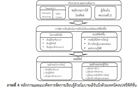 | Description | ศึกษาหลักการและแนวทางการประยุกต์ใช้โมบายเลิร์นนิ่งและเทคนิคสเปซรีพิททิชั่น โดยหลักการและแนวคิดของโมบายเลิร์นนิ่ง คือ การเรียนรู้ได้ทุกที่ทุกเวลา เรียนรู้ได้ทันทีและเรียนรู้แบบมีกระบวนการ หลักการและแนวคิดของเทคนิคสเปซรีพิททิชั่น คือ กระตุ้นให้เกิดการเรียนรู้ มีการเรียนรู้แบบตอบสนอง และช่วยให้จดจำความรู้สึกได้ดี สามารถตอบสนองต่อ บริบท สภาพ และความต้องการของประเทศไทย ที่มีนโยบายไทยแลนด์ 4.0 ที่มุ่งเน้นประเทศไทย ด้วยเทคโนโลยีสารสนเทศรวมถึงพัฒนาดิจิทัลคอนเทนท์ และ พฤติกรรมของเยาวชนที่มีการใช้โทรศัพท์อย่างแพร่หลาย รวมถึงทักษะที่จำเป็นสำหรับการเรียนรู้ในศตวรรษที่ 21 |