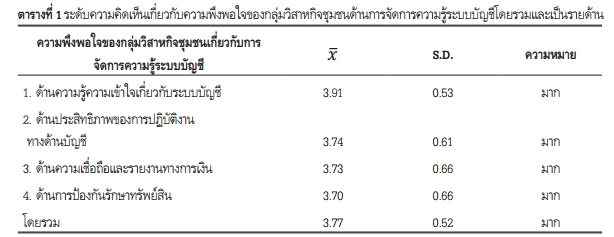 | Description | ศึกษาการจัดการความรู้ระบบบัญชีของกลุ่มวิสาหกิจชุมชนทอผ้าไหม เพิ่มประสิทธิภาพ รายงานทางการเงิน และศึกษาความพึงพอใจเกี่ยวกับระบบบัญชีของกลุ่มวิสาหกิจชุมชนทอผ้าไหม อำเภอนาดูน จังหวัดมหาสารคาม ผลการประเมินจากการจัดการความรู้ระบบบัญชีของสมาชิกภายในกลุ่ม ทำให้เกิดความรู้ความเข้าใจเกี่ยวกับการจัดทำบัญชี และ กระบวนการจัดทำบัญชีได้เป็นอย่างดี และได้ทำการมอบระบบบัญชีให้กับประธานกลุ่มวิสาหกิจชุมชนทอผ้าไหม เป็นผู้ดูแลระบบบัญชี ของกลุ่ม พร้อมด้วยการจัดทำรายงานทางการเงิน ทุกสิ้นเดือน และสิ้นปี เพื่อเกิดความโปร่งใส และความเชื่อถือได้ของกลุ่มสมาชิก จากการอบรมจัดการความรู้ระบบบัญชีของกลุ่มวิสาหกิจชุมชนทอผ้าไหมมีความพึงพอใจต่อการจัดการความรู้ระบบบัญชี อยู่ในระดับมาก |
