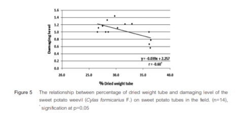 Description จากการศึกษาความชอบในการเข้าทำลายของด้วงงวงมันเทศ (Cylas formicarius F.) บนมันเทศ 219 พันธุ์ ในสภาพแปลงปลูก ณ ศูนย์วิจัยและพัฒนาการเกษตรพิจิตร จังหวัดพิจิตร และการศึกษาความชอบในการกินหัวมันเทศสดในพันธุ์ที่ผ่านการคัดเลือก ในห้องปฏิบัติการแบบ No-Choice รวมถึงศึกษาความสัมพันธ์ระหว่างการทำลายกับโทนสีของหัวมันเทศ เปอร์เซ็นต์น้ำหนักยางแห้ง เปอร์เซ็นต์น้ำหนักหัวมันแห้ง และปริมาณสารประกอบฟีนอลิก พบว่า ด้วงงวงมันเทศชอบเข้าทำลายหัวมันเทศที่มีโทนสีต่าง ๆ ไม่แตกต่างกันทางสถิติ ที่ระดับความเชื่อมั่น 95% มันเทศ 14 สายพันธุ์ มีการทำลายของด้วงงวงมันเทศในสภาพแปลงไม่เกิน 37.5% ได้แก่ พันธุ์อีดก, มันไทรโยค, ป้าก้าน-2, มันไข่ตราด, มันไข่นครฯ-2, กาฬสินธุ์, มันเหลืองบ้านหลวง, มันไข่เชียงใหม่, บ้านแยง, บ้านแยง-9, S0183, CIP-35-5, BB95040-16 และ CIP-14-1 โดยพันธุ์มันเทศข้างต้นมีความสัมพันธ์ทางด้านลบกับเปอร์เซ็นต์น้ำหนักยางแห้งและเปอร์เซ็นต์น้ำหนักหัวมันแห้งอย่างมีนัยสำคัญทางสถิติที่ 95% และมีความสัมพันธ์ทางด้านลบกับสารประกอบฟีนอลิก อย่างมีนัยสำคัญทางสถิติที่ 99% โดยมีค่าสหสัมพันธ์ r เท่ากับ -0.55, -0.60 และ -0.83 ตามลำดับ ผลการศึกษาสามารถนำมาใช้ประโยชน์ เพื่อการปรับปรุงพันธุ์มันเทศที่ต้านทานต่อด้วงงวงมันเทศ