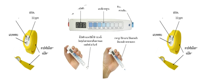 | Description | “อุปกรณ์ตรวจวัดคลอรีนภาคสนาม” เป็นอุปกรณ์ที่ใช้งานง่าย พกพาสะดวก รู้ผลรวดเร็ว ราคาถูก สามารถใช้ซ้ำได้ และสามารถประยุกต์กับอุตสาหกรรมอาหาร และอุตสาหกรรมที่เกี่ยวข้องกับการบำบัดน้ำ น้ำประปา และสระว่ายน้ำ เพื่อใช้ในการติดตามระดับความเข้มข้นของคลอรีนที่ใช้ในกระบวนต่าง ๆ ส่วนสิ่งประดิษฐ์คิดค้น “อุปกรณ์ตรวจวัดคลอรีนแบบสวมใส่” เป็นอุปกรณ์ที่มีลักษณะเป็นสายรัดข้อมือ สำหรับตรวจวัดคลอรีนที่ใช้งานง่าย มีขนาดเล็ก น้ำหนักเบา พกพาสะดวก รู้ผลรวดเร็ว ลดการนำเข้า จากต่างประเทศ ราคาถูก และสามารถประยุกต์ใช้สำหรับการตรวจวัดคลอรีนในน้ำในสระว่ายน้ำเพื่อความปลอดภัยต่อสุขภาพของผู้ที่ใช้สระว่ายน้ำซึ่งผู้ใช้สามารถทราบระดับคลอรีนอย่างง่ายได้ด้วยตัวเอง |