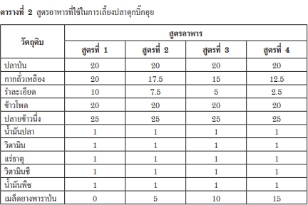 | Description | ปลาดุกบิ๊กอุยที่ได้รับอาหารทดลองที่มีเมล็ดยางพาราป่น 5 % มีน้ำหนักและความยาวที่เพิ่มขึ้น ดีที่สุด (p<0.05) คิดเป็น 25.14 ± 5.87 กรัม/ตัว และ 6.27±0.97 เซนติเมตร/ตัว อัตราการแลกเนื้อปลาดุกบิ๊กอุยที่เลี้ยงด้วยอาหารสูตรควบคุม อาหารที่ผสมเมล็ดยางพาราป่น 5 % และ 10 % ไม่แตกต่างกัน แต่ต่ำกว่าปลาดุกบิ๊กอุยที่ได้รับอาหารทดลองสูตรที่ผสมเมล็ดยางพาราป่าน 15 % อย่างมีนัยสำคัญ (p<0.05) ปลาดุกบิ๊กอุยที่ได้รับอาหารทดลองทุกสูตร มีอัตราการรอดตายในเกณฑ์ที่ดี คือ 93.33 – 100.00 % เมื่อคำนวณต้นทุนการผลิตอาหาร พบว่า อาหารทดลองที่ประกอบด้วยเมล็ดยางพาราป่น 15 % มีต้นทุนการผลิตต่ำที่สุด คือ 14.80 บาท/กิโลกรัม รองลงมาคือ อาหารทดลองที่ประกอบด้วยเมล็ดยางพาราป่น 10 % 5 % และ 0 % คือ 14.94, 15.09 และ 15.23 บาท/กิโลกรัม โดยที่เมล็ดยางพาราสามารถนำมาใช้เป็นวัตถุดิบในการเลี้ยงปลาดุกบิ๊กอุยได้ ในระดับ 5 % ในสูตรอาหาร |