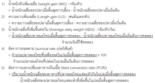 | Description | การทดลองแบ่งเป็น 3 กลุ่ม และให้อาหารตามสูตร การทดลองชุดที่1. อาหารสำเร็จรูปโปรตีน 32% (ชุดควบคุม) การทดลองชุดที่ 2. อาหารสำเร็จรูปโปรตีน 32% ผสมสารเสริมโปรไบโอติก 0.75% และชุดการทดลองที่ 3 อาหารสำเร็จรูปโปรตีน 32% ผสมสารเสริมอีเอ็ม 0.10% การทดลองแบบสุ่มอย่างสมบูรณ์ จำนวน 3 ซ้ำ การทดลองเลี้ยงปลาหมอไทยน้ำหนักเริ่มต้นเฉลี่ย 0.29 กรัม ในกระชังขนาด 5 x 5 x 1.5 ม. จำนวน 750 ตัวต่อกระชัง เวลาการเลี้ยง 90 วัน เก็บข้อมูลทุก 15 วัน พบว่า น้ำหนักเพิ่มเฉลี่ย ความยาวเพิ่มเฉลี่ย และน้ำหนักเฉลี่ย ที่เพิ่มขึ้นต่อวันไม่มีความแตกต่างกันทางสถิติ (P>0.05) อัตราการแลกเปลี่ยนอาหารเป็นเนื้อและอัตราการรอดตายมีความแตกต่างกันทางสถิติ (P<0.05) เมื่อสิ้นสุดการทดลองปลาหมอไทยที่ได้รับสารเสริมโปรไบโอติกมีอัตราการแลกเปลี่ยนอาหารเป็นเนื้อ อัตราการรอดตายดีที่สุด อาหารสำเร็จรูปโปรตีน 32% ผสมสารเสริมโปรไบโอติก มีผลต่ออัตราการแลกเปลี่ยนอาหารเป็นเนื้อและอัตราการรอดตาย แต่ไม่มีผลต่ออัตราการเจริญเติบโตของปลาหมอไทย |