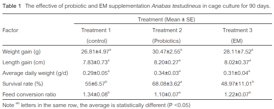 การเสริมโปรไบโอติกและอีเอ็มในอาหารต่อการเจริญเติบโตและ อัตราการรอดของปลาหมอไทยที่เลี้ยงในกระชัง Dietary probiotic and effective microorganisms (EM) supplementation on growth performance and survival rate of climbing perch, Anabas testudineus in cage cultu |