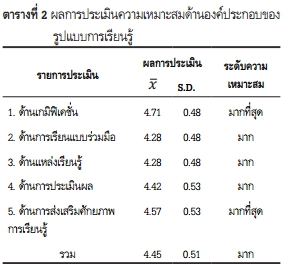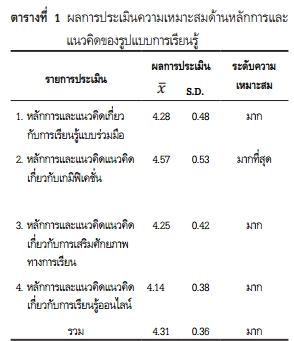 Description สังเคราะห์รูปแบบการเรียนรู้ร่วมมือแบบเกมิฟิเคชั่นออนไลน์ และประเมินรูปแบบการเรียนรู้ที่สังเคราะห์ขึ้น พบว่า รูปแบบการเรียนรู้ร่วมมือแบบเกมิฟิเคชั่นออนไลน์ที่สังเคราะห์ขึ้นมี 5 องค์ประกอบ คือ ด้านเกมิฟิเคชั่น ด้านการเรียนแบบร่วมมือ ด้านแหล่งเรียนรู้ ด้านการประเมินผล และด้านการเสริมสร้างศักยภาพการเรียนรู้ โดยมีกระบวนการเรียนรู้ 5 ขั้นตอน (5A) คือ 1. กระตุ้นความคิด 2. ภารกิจเบื้องต้น 3. ผจญภัย 4.วินิจฉัยผลงาน และ 5.วิจารณ์สะท้อนผล รูปแบบการเรียนรู้ที่สังเคราะห์ขึ้นนี้ มีผลการประเมินความเหมาะสมมาก สามารถนำไปเป็นต้นแบบในการพัฒนาเครื่องมือในการจัดการเรียนรู้ได้