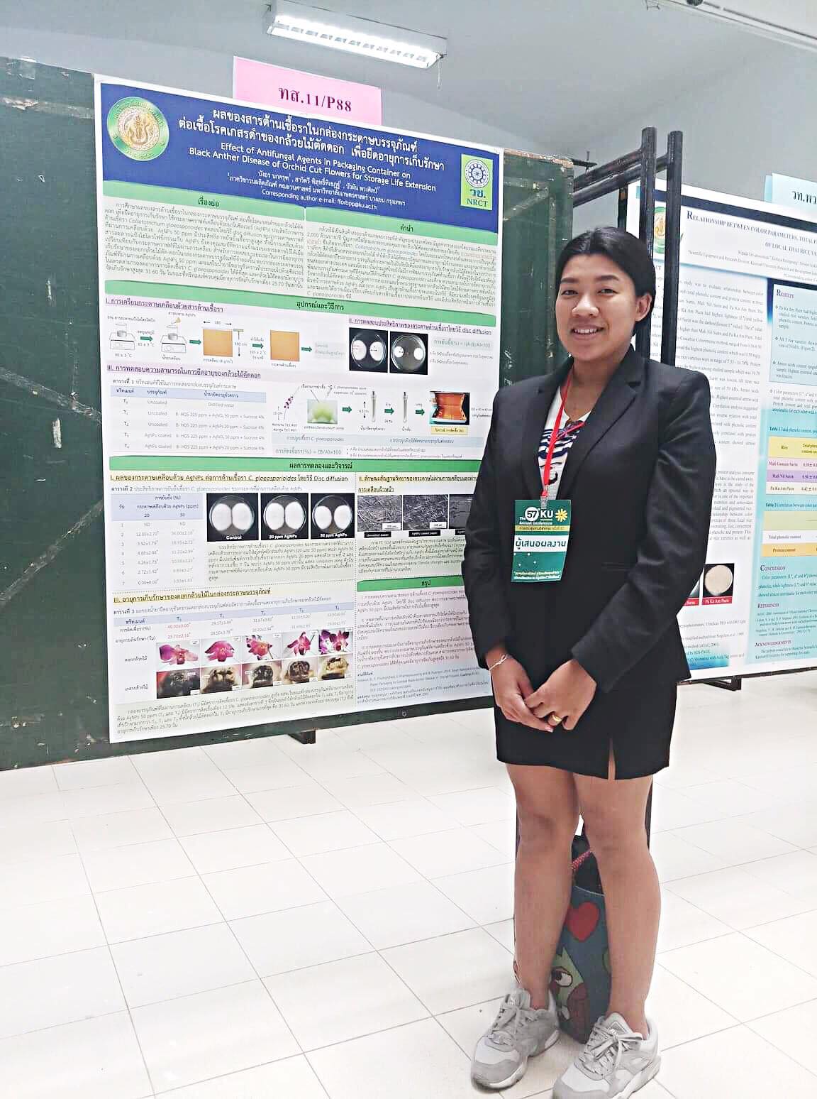 | Description | การพัฒนาบรรจุภัณฑ์ต้านเชื้อรา C. gloeosporioides เพื่อใช้ในการส่งออกกล้วยไม้ตัดดอก พบว่ากระดาษที่ผ่านการเคลือบผิวหน้าด้วยสารละลายแป้งไฮโดรโฟบิกร่วมกับนาโนซิลเวอร์ สามารถต้านเชื้อรา C. gloeosporioides ในจาน PDA ได้ดี เมื่อนำกระดาษต้านเชื้อราดังกล่าวมาทดสอบการยืดอายุการเก็บรักษากล้วยไม้ตัดดอก พบว่ากล่องบรรจุภัณฑ์ที่ผ่านการเคลือบด้วยนาโนซิลเวอร์สามารถยืดอายุการเก็บรักษากล้วยไม้ตัดดอกได้ 31 วัน เมื่อเปรียบเทียบกับชุดควบคุมที่มีอายุการเก็บรักษาเพียง 25 วัน เนื่องจากอัตราการติดเชื้อรา C. gloeosporioides ในกล้วยไม้ตัดดอกลดลง |