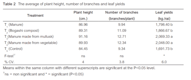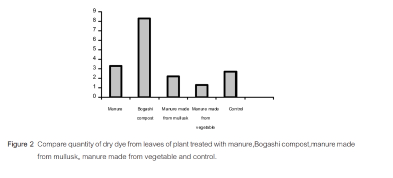| Description | ทำการศึกษาลักษณะทางพฤกษศาสตร์ การเพิ่มผลผลิตใบ ปริมาณสี และครามผงของครามงอ พบว่า ครามงอ (Indigo tinctoria L.) เป็นไม้พุ่มสูง 121.08 ซม. ใบประกอบขนนก มีใบย่อย 3-13 ใบ ดอกเป็นช่อแบบกระจะ (raceme) สีชมพูอมแดง ฝักโค้งงอ เมล็ดแก่สีดำ ระยะปลูกของครามงอ ที่ระยะปลูก 25 x 60 ซม. เป็นระยะที่เหมาะสม เนื่องจากให้ผลผลิตใบมากที่สุด 4,379.73 กก./ไร่ ปุ๋ยน้ำหมักหอยเชอรี่ และปุ๋ยน้ำหมักผักดีที่สุด เนื่องจากให้ผลผลิตใบครามมากที่สุดเท่ากับ 2,069.33 และ 2,048.00 กก./ไร่ ส่วนปุ๋ยหมักโบกาฉิดีที่สุด เนื่องจากให้ปริมาณสีครามและปริมาณครามผงต่อใบคราม 500 ก. มากที่สุดเท่ากับ 8.792 ก. และ 1.816 ก. ตามลำดับ |