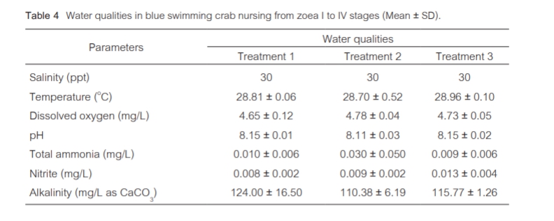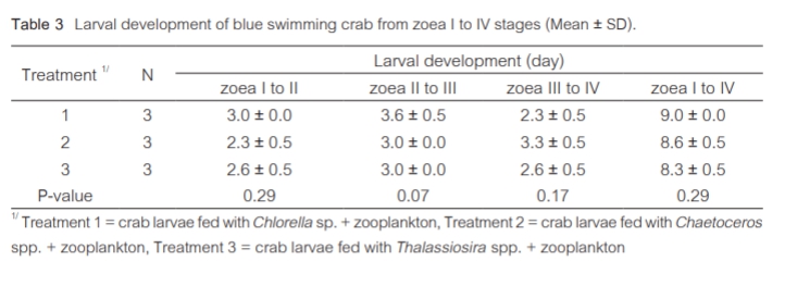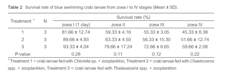 ผลของไดอะตอม Thalassiosira spp. ต่ออัตรารอดตาย และพัฒนาการของลูกปูม้า (Portunus pelagicus) วัยอ่อนระยะซูเอี้ย 1 ถึง 4 |