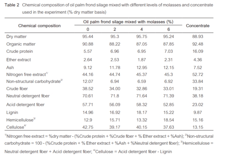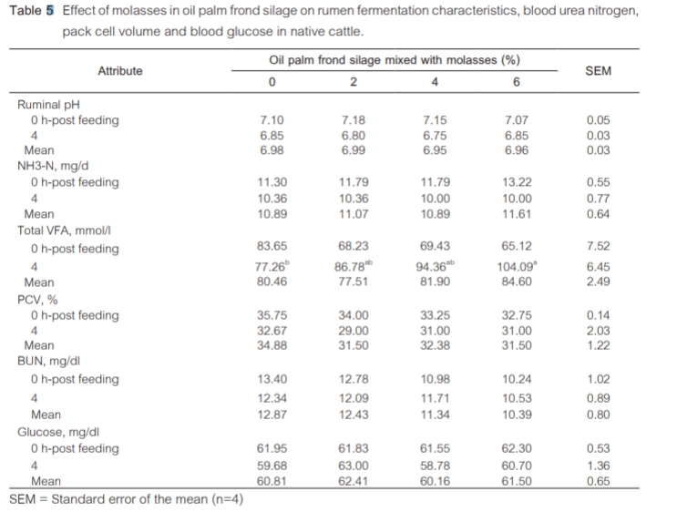| Description | วัตถุประสงค์ของการศึกษาครั้งนี้เพื่อประเมินผลของทางใบปาล์มน้ำมันที่หมักร่วมกับกากน้ำตาลที่ระดับ 0, 2, 4 และ 6% ต่อการใช้ประโยชน์ได้ของโภชนะและกระบวนการหมักในกระเพาะรูเมนของโคพื้นเมือง ใช้โคเพศผู้ อายุ 2.7-2.8 ปี น้ำหนักเฉลี่ย 280±5 กก. โดยโคได้รับทางใบปาล์มน้ำมันที่หมักแบบเต็มที่และให้อาหารข้น คิดเป็นวัตถุแห้งในปริมาณ 0.5% ของน้ำหนักตัว ผลการศึกษาพบว่า ปริมาณการกินได้วัตถุแห้งและอินทรียวัตถุของทางใบปาล์มน้ำมันที่หมักร่วมกับกากน้ำตาลที่ระดับต่าง ๆ ไม่แตกต่างกัน สำหรับปริมาณการกินได้ของโปรตีนรวม ผนังเซลล์ และลิกโนเซลลูโลสในโคที่ได้รับทางใบปาล์มน้ำมันที่หมักร่วมกับกากน้ำตาลที่ระดับ 2, 4 และ 6% สูงกว่าโคที่ได้รับทางใบปาล์มน้ำมันที่หมักร่วมกับกากน้ำตาลที่ระดับ 0% อย่างไรก็ตาม สัมประสิทธิ์การย่อยได้ของวัตถุแห้ง อินทรียวัตถุ โปรตีนรวม ผนังเซลล์ ลิกโนเซลลูโลส และโภชนะที่ย่อยได้รวมของโคทั้ง 4 กลุ่ม ไม่แตกต่างกัน |