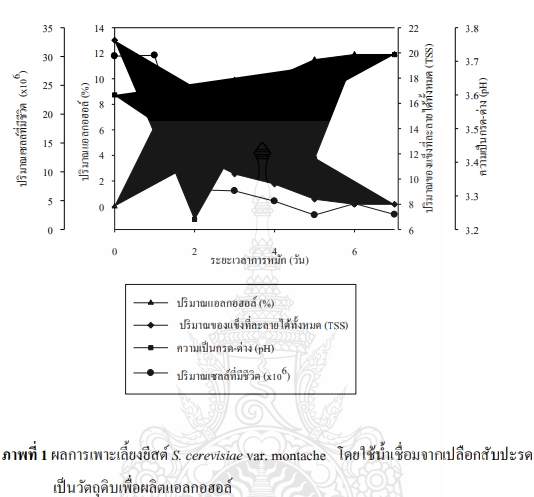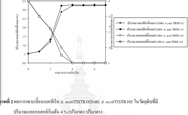 Description การศึกษาสายพันธุ์แบคทีเรียสร้างกรดอะซิติกที่เหมาะสม ได้แก่ สายพันธุ์ Acetobacter aceti TISTR 102 และ A. aceti TISTR 103 ทำการเพาะเลี้ยงแบคทีเรียในวัตถุดิบที่มีความเข้มข้นแอลกอฮอล์ 4 เปอร์เซ็นต์ เติมแอมโนเนียมฟอสเฟตความเข้มข้นดังนี้ 0.5, 1.0 และ 2.0 กรัมต่อลิตร พบว่า การใช้เชื้อแบคทีเรีย A. aceti TISTR 103 เปลี่ยนแอลกอฮอล์เป็นกรดอะซิติกได้สูงที่การเติมแอมโมเนียมฟอสเฟต 0.5 กรัมต่อลิตร สามารถผลิตกรดอะซิติกได้ความเข้มข้น 3.9 เปอร์เซ็นต์ สูตรน้ำส้มสายชูหมักเพื่อสุขภาพจากน้ำเชื่อมเปลือกสับปะรด คือ น้ำส้มสายชูหมัก 50 เปอร์เซ็นต์ น้ำผึ้ง 15 เปอร์เซ็นต์ น้ำผลไม้ 35 เปอร์เซ็นต์ ผู้บริโภคชอบน้ำฝรั่ง ในการนำมาเป็นส่วนผสมมากที่สุด ด้านประสาทสัมผัสผู้บริโภคให้คะแนนความชอบเฉลี่ย 6.37 ผู้บริโภคยอมรับน้ำส้มสายชูหมักจากเปลือกสับปะรดในระดับดี จึงสามารถพัฒนาไปสู่ระดับอุตสาหกรรมได้