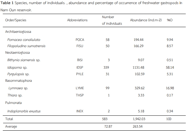 ความชุกชุมของหอยฝาเดียวน้ำจืดและความสัมพันธ์ระหว่างคุณภาพน้ำ บริเวณอ่างเก็บน้ำเขื่อนน้ำอูน จังหวัดสกลนคร