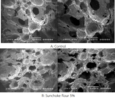 | Description | การวิเคราะห์สมบัติทางเคมีกายภาพของแป้งแก่นตะวัน พบว่า มีความชื้น เถ้า เยื่อใยหยาบ โปรตีน ไขมัน และอะไมโลส ร้อยละ 7.52, 3.40, 3.10, 4.10, 2.51 และ 0.04 ตามลำดับ องค์ประกอบส่วนใหญ่คือ คาร์โบไฮเดรต ร้อยละ 82.36, ประกอบด้วยใยอาหารที่ละลายน้ำ ร้อยละ 40.07, ใยอาหารที่ไม่ละลายน้ำ ร้อยละ 13.04 และใยอาหารทั้งหมด ร้อยละ 53.11 ด้านความหนืดพบว่า เมื่อเพิ่มสัดส่วนของแป้งแก่นตะวันจะทำให้ค่า peak viscosity, final viscosity, breakdown และ setback ของแป้งขนมปังมีแนวโน้มลดลง แต่เมื่อเติมแซนแทนกัม ร้อยละ 0.5 ส่งผลให้ค่าดังกล่าวมีแนวโน้มเพิ่มขึ้น เมื่อนำแป้งแก่นตะวันมาประยุกต์ใช้ในผลิตภัณฑ์ขนมปังที่ระดับร้อยละ 0, 5, 10, 15 และ 20 พบว่า ระดับที่เพิ่มมากขึ้นทำให้ปริมาตรและปริมาตรจำเพาะลดลง เนื้อสัมผัสแข็งขึ้น ค่าการเกาะตัวและความยืดหยุ่นลดลง ความยากในการเคี้ยวมากขึ้น แต่เมื่อเติมแซนแทนกัม ร้อยละ 0.5 ส่งผลให้ปริมาตรจำเพาะของขนมปังเพิ่มขึ้น เนื้อสัมผัสนุ่มขึ้น ค่าการเกาะตัวและความยืดหยุ่นเพิ่มขึ้น การประเมินการยอมรับทางประสาทสัมผัสพบว่า ขนมปังที่มีการเติมแป้งแก่นตะวันที่ระดับร้อยละ 5 ผู้บริโภคให้คะแนนการยอมรับทางประสาทสัมผัสไม่แตกต่างจากตัวอย่างควบคุม |