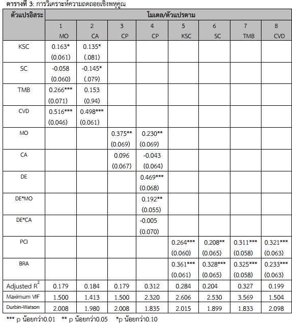Description ตรวจสอบปัจจัยสาเหตุ ได้แก่ การรับรู้ความรุนแรงทางการแข่งขัน การตระหนักรู้ถึงความสัมพันธ์ทางธุรกิจ ที่มีความสัมพันธ์กับปัจจัย ได้แก่ โอกาสทางการตลาด ความได้เปรียบทางการแข่งขัน โดยผ่านตัวแปรกลาง พบว่า การรับรู้ความรุนแรงทางการแข่งขัน และการตระหนักรู้ถึงความสัมพันธ์ทางธุรกิจส่งผลกระทบเชิงบวกกับศักยภาพกลยุทธ์เครือข่าย 4 มิติ คือความสามารถในการแบ่งปันความรู้ การผสานผนึกกำลังการดำเนินงานร่วมกัน การรักษาสิทธิประโยชน์ร่วมกันบนพื้นฐานความไว้วางใจ และการร่วมสร้างคุณค่าวัฒนธรรมต่างองค์กรสำหรับศักยภาพกลยุทธ์เครือข่ายผลกระทบเชิงบวกกับโอกาสทางการตลาด และความได้เปรียบทางการแข่งขัน 3 มิติ ยกเว้นการผสานผนึกกำลังการดำเนินงานร่วมกันไม่ส่งผลกระทบกับโอกาสทางการตลาด และความได้เปรียบการแข่งขัน สามารถใช้กำหนดทางพัฒนาศักยภาพกลยุทธ์เครือข่ายธุรกิจโรงแรม เพื่อส่งสริมให้เกิดผลการดำเนินงานธุรกิจที่มีประสิทธิภาพมากขึ้น