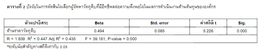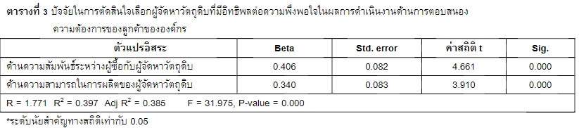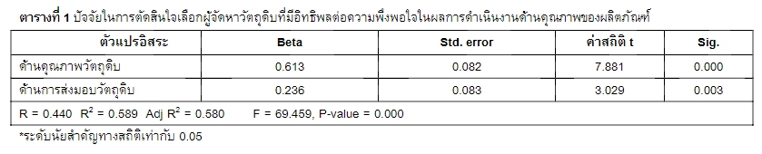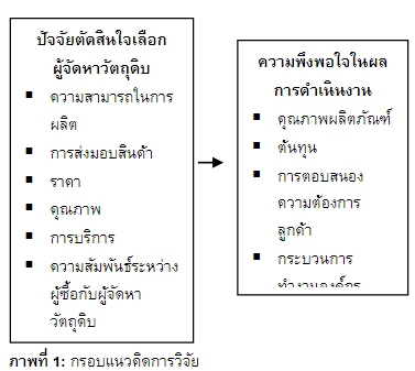 | Description | ศึกษาอิทธิพลของปัจจัยในการตัดสินใจเลือกผู้จัดหาวัตถุดิบต่อความพึงพอใจในผลการดำเนินงานขององค์กรผู้ซื้อ จากมุมมองของผู้ประกอบการธุรกิจวิสาหกิจขนาดกลางและขนาดย่อมประเภทกิจการผลิตสินค้าในจังหวัดนครราชสีมา พบว่า การให้ความสำคัญต่อคุณภาพวัตถุดิบ และการส่งมอบวัตถุดิบมีอิทธิพลต่อความพึงพอใจผลการดำเนินงานด้านคุณภาพผลิตภัณฑ์ และการให้ความสำคัญต่อราคาวัตถุดิบมีอิทธิพลต่อความพึงพอใจผลการดำเนินงานด้านต้นทุนขององค์กรผู้ซื้อ และการให้ความสำคัญต่อความสัมพันธ์ระหว่างองค์กรผู้ซื้อกับผู้จัดหาวัตถุดิบ และความสามารถในการผลิตของผู้จัดหาวัตถุดิบมีอิทธิพลต่อความพึงพอใจผลการดำเนินงานด้านการตอบสนองความต้องการของลูกค้า รวมถึงการให้ความสำคัญต่อการบริการของผู้จัดหาวัตถุดิบมีอิทธิพลต่อความพึงพอใจผลการดำเนินงานด้านกระบวนการทำงานขององค์กรผู้ซื้อ |