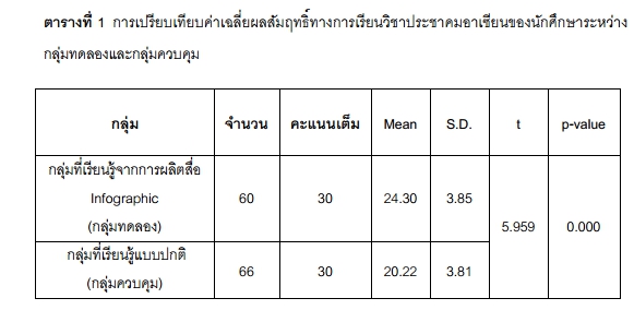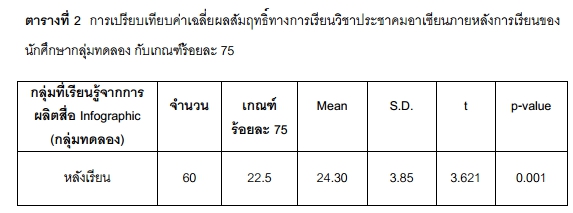 | Description | เปรียบเทียบผลสัมฤทธิ์ทางการเรียนวิชาประชาคมอาเซียนของนักศึกษาระหว่างกลุ่มที่เรียนรู้จากการผลิตสื่อ Infographic และกลุ่มเรียนรู้แบบปกติ พบว่า กลุ่มที่เรียนรู้จากการผลิตสื่อ Infographic มีค่าเฉลี่ยผลสัมฤทธิ์ทางการเรียนสูงกว่ากลุ่มที่เรียนรู้แบบปกติอย่างมีนัยสำคัญทางสถิติที่ระดับ0.05 และกลุ่มที่เรียนรู้จากการผลิตสื่อ Infographic มีค่าเฉลี่ยผลสัมฤทธิ์ทางการเรียนสูงกว่าเกณฑ์ร้อยละ 75 อย่างมีนัยสำคัญทางสถิติที่ระดับ 0.05 |