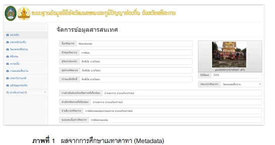 | Description | สำรวจและรวบรวมข้อมูลความต้องการของนักวิชาการ ด้านวัฒนธรรมศึกษา เมทาดาทา (Metadata)ระบบฐานข้อมูลดิจิทัล และพัฒนาฐานข้อมูลดิจิทัลที่เหมาะสมสำหรับจัดเก็บข้อมูลดิจิทัลวัฒนธรรม และภูมิปัญญาท้องถิ่น จังหวัดศรีสะเกษ ให้อยู่ในรูปแบบอิเล็กทรอนิกส์ที่สามารถสืบค้นได้ผ่านระบบเครือข่ายอินเตอร์เน็ต พบว่า ผลการทดสอบ และประเมินผลฐานข้อมูลในส่วนเนื้อหามีความเหมาะสมมาก ข้อที่มีค่าเฉลี่ยสูงที่สุด ได้แก่ ประโยชน์ที่ได้รับจากเนื้อหาข้อมูลมีความเหมาะสม ในส่วนการสืบค้น มีความเหมาะสมระดับปานกลาง ข้อที่มีค่าเฉลี่ยสูงสุด ได้แก่ นำเสนอผลการสืบค้นได้อย่างถูกต้องเหมาะสม ส่วนการติดต่อกับผู้ใช้มีความเหมาะสมมาก ข้อที่มีค่าเฉลี่ยสูงที่สุด ได้แก่ รูปแบบการแสดงความช่วยเหลือของฐานข้อมูลเหมาะสม และคู่มือการใช้มีความละเอียดครอบคลุมเหมาะสม ส่วนของลักษณะของฐานข้อมูล มีความเหมาะสมอยู่ในระดับมาก ข้อที่มีค่าเฉลี่ยสูงที่สุด ได้แก่ การออกแบบหน้าหลัก การกำหนดผู้ใช้ การจัดวางกราฟฟิก และปุ่มคำสั่งต่างๆมีความเหมาะสม |