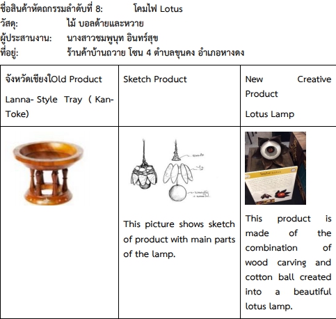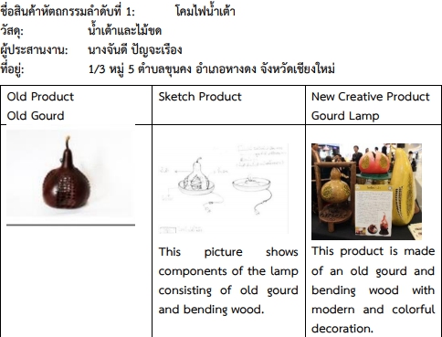 Description การพัฒนาสินค้าโดยใช้วิธีศึกษาเชิงพัฒนาและปฏิบัติการอย่างมีส่วนร่วม กลุ่มตัวอย่างคือ ผู้ประกอบการ หรือ ผู้ผลิตสินค้า (กลุ่มไม้แกะสลัก/กลุ่มของที่ระลึก/กลุ่มจักสาน) เพื่อจำหน่ายในหมู่บ้านถวาย ใช้เทคนิคการประชุมแบบ AIC ได้แก่ การสร้างความรู้ การสร้างแนวทางการพัฒนาและการสร้างแนวทางการปฏิบัติ ใช้เทคนิคการประชุมกลุ่มย่อย เพื่อพัฒนาสินค้าหัตถกรรมสร้างสรรค์ต้นแบบ พบว่า สินค้าหัตถกรรมใหม่ที่ผลิตขึ้นจากการศึกษานี้ทั้ง 10 ชิ้น เป็นการสร้างสรรค์ของชาวบ้านซึ่งเป็นผู้ผลิตแท้จริง จึงเป็นการต่อยอดจากสินค้าหัตถกรรมเดิม ซึ่งเกิดจากการได้รับความรู้เชิงวิชาการ การถอดองค์ความรู้เพื่อค้นหาสินค้าหัตถกรรมที่เป็นอัตลักษณ์ เพื่อสร้างเรื่องเล่านับเป็นการสร้างมูลค่าเพิ่ม เสริมคุณค่าทางการตลาด เสริมสร้างความคิดสร้างสรรค์ในการพัฒนาสินค้าหัตถกรรม จัดว่ามีส่วนสำคัญอย่างยิ่งต่อการส่งเสริมการท่องเที่ยวบ้านถวาย หน่วยงานภาครัฐควรสนับสนุน ส่งเสริมและหาตลาดรองรับสินค้าหัตถกรรมของชุมชน ให้ความช่วยเหลือในด้านการตลาดและการประชาสัมพันธ์ โดยเฉพาะการประชาสัมพันธ์ผ่านสื่อโทรทัศน์และสื่อสังคมออนไลน์