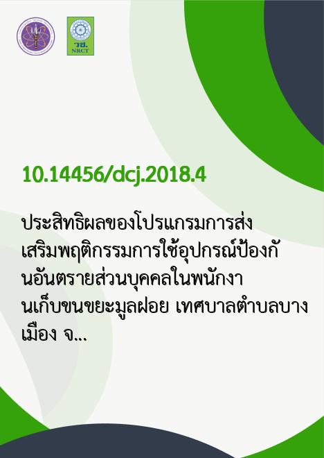 ประสิทธิผลของโปรแกรมการส่งเสริมพฤติกรรมการใช้อุปกรณ์ป้องกันอันตรายส่วนบุคคลในพนักงานเก็บขนขยะมูลฝอย เทศบาลตำบลบางเมือง จังหวัดสมุทรปราการ |