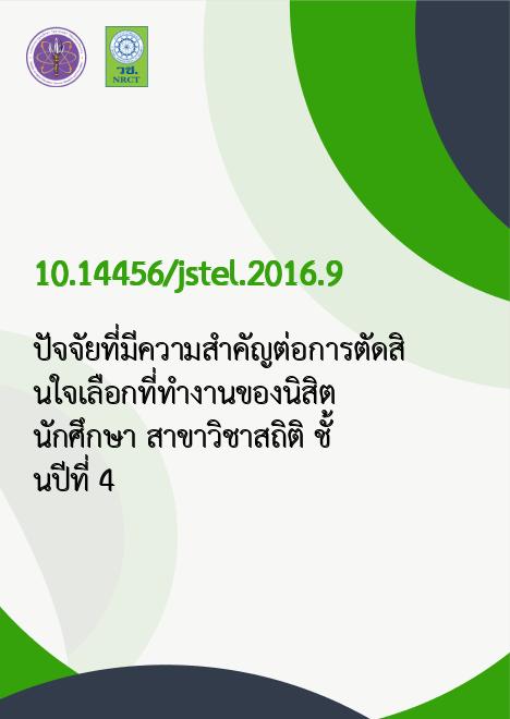 | Title | ปัจจัยที่มีความสำคัญต่อการตัดสินใจเลือกที่ทำงานของนิสิต/นักศึกษา สาขาวิชาสถิติ ชั้นปีที่ 4 |