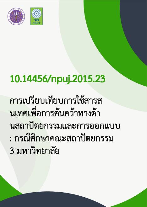 | Title | การเปรียบเทียบการใช้สารสนเทศเพื่อการค้นคว้าทางด้านสถาปัตยกรรมและการออกแบบ : กรณีศึกษาคณะสถาปัตยกรรม 3 มหาวิทยาลัย |