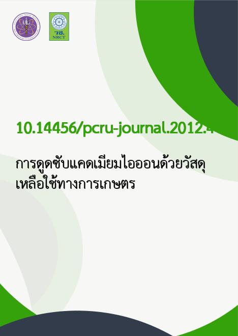 การดูดซับแคดเมียมไอออนในสารละลายด้วยวัสดุเหลือใช้ทางการเกษตร ได้แก่ เปลือกสับปะรด เปลือกมะละกอ และเปลือกลูกตาลครั้งนี้ มีวัตถุประสงค์เพื่อศึกษาผลของพีเอช ความเข้มข้นแคดเมียมไอออนเริ่มต้น และระยะเวลาการดูดซับ โดยทำการทดลองแบบแบช ผลการทดลองพบว่าวัสดุเหลือใช้ทางการเกษตรมีแนวโน้มคล้ายคลึงกัน โดยพบว่าที่พีเอช 4 มีค่าการดูดซับสูงสุด ไอโซเทอมของการดูดซับมีลักษณะความสัมพันธ์ตามแบบแลงเมียร์ไอโซเทอม ซึ่งเปลือกลูกตาลให้ค่าการดูดซับสูงสุดที่ 33.11 มิลลิกรัมต่อกรัม รองลงมาคือ เปลือกสับปะรด และเปลือกมะละกอ ให้ค่าการดูดซับสูงสุด 32.68 และ 31.65 มิลลิกรัมต่อกรัม ตามลำดับ และเวลาที่ใช้ในการดูดซับที่สมดุลเกิดขึ้นอย่างรวดเร็วที่ 15 10 และ 10 นาที สำหรับเปลือกสับปะรด เปลือกมะละกอ และเปลือกลูกตาล ตามลำดับ และอธิบายอันดับของอัตราการเกิดปฏิกิริยาได้ด้วยสมการอัตราปฏิกิริยาอันดับสอง แสดงว่าอัตราการควบคุมปฏิกิริยาอาจจะเป็นการดูดซับทางเคมี ที่เกี่ยวข้องกับแรงวาเลน ที่อาจจะเกิดจากการใช้ร่วมกัน หรือการแลกเปลี่ยนอิเลกตรอนระหว่างตัวดูดซับ และตัวถูกดูดซับ ดังนั้นชี้ให้เห็นว่าวัสดุเหลือใช้ทางการเกษตร ได้แก่ เปลือกสับปะรด เปลือกมะละกอ และเปลือกลูกตาลที่เป็นของเสียสามารถเป็นตัวดูดซับทางชีวภาพในการเคลื่อนย้ายแคดเมียมอิออนจากสารละลายจะเป็นมิตรกับสิ่งแวดล้อม รวมทั้งมีต้นทุนต่ำ หรือมีราคาถูกหรือไม่มีราคา และยังมีความสามารถในการดูดซับแคดเมียมสูงอีกด้วย