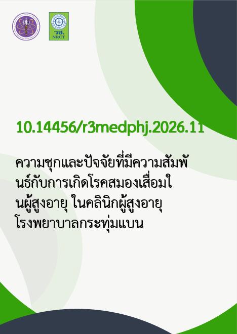 Abstract วัตถุประสงค์: เพื่อศึกษาความชุกและปัจจัยที่เกี่ยวข้องกับภาวะสมองเสื่อมในผู้สูงอายุที่มารับบริการที่คลินิกผู้สูงอายุ โรงพยาบาลกระทุ่มแบน จังหวัดสมุทรสาครวิธีการศึกษา: การวิจัยครั้งนี้เป็นการศึกษาแบบ Cross-sectional study โดยใช้ข้อมูลย้อนหลังจาก เวชระเบียน ของผู้สูงอายุที่มารับบริการคลินิกผู้สูงอายุ โรงพยาบาลกระทุ่มแบน จังหวัดสมุทรสาคร กลุ่มตัวอย่างคือ เวชระเบียนของผู้สูงอายุจำนวน 149 ราย ที่มารับบริการระหว่างวันที่ 1 ตุลาคม พ.ศ. 2566 - 30 กันยายน พ.ศ. 2567 โดยใช้เครื่องมือในการเก็บข้อมูล ได้แก่ แบบสอบถามข้อมูลพื้นฐาน, แบบประเมิน MMSE-Thai 2002, GLIM criteria, TGDS, และการตรวจทางห้องปฏิบัติการ เช่น HbA1C, LDL-C, HDL-C, Hemoglobin, และ Albuminผลการศึกษา: ผลการศึกษาพบว่าอัตราความชุกของภาวะสมองเสื่อมในกลุ่มตัวอย่างสูงถึงร้อยละ 57.7 โดยกลุ่มที่มีภาวะสมองเสื่อมมีลักษณะทั่วไป เช่น อายุเฉลี่ย 77.9 ± 7.7 ปี และมีอัตราการเกิดโรคเบาหวานและความดันโลหิตสูงสูง ในขณะที่ปัจจัยที่มีความสัมพันธ์กับภาวะสมองเสื่อมคือ ภาวะทุพโภชนาการ (p-value< 0.05) และระดับ LDL (p-value< 0.05) สรุป: การศึกษานี้แสดงให้เห็นว่า ภาวะทุพโภชนาการและระดับ LDL เป็นปัจจัยที่มีความสัมพันธ์กับภาวะสมองเสื่อมในผู้สูงอายุ ข้อมูลนี้สามารถนำไปใช้ในการพัฒนาระบบการคัดกรองและการดูแลผู้สูงอายุในชุมชน ที่กำลังเข้าสู่สังคมผู้สูงอายุ คำสำคัญ: ภาวะสมองเสื่อม, ผู้สูงอายุ, การคัดกรอง, ทุพโภชนาการ, LDL