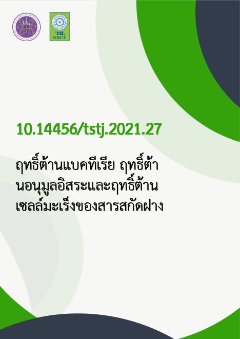 | Keyword | ฤทธิ์ต้านแบคทีเรียก่อโรค, ฤทธิ์ต้านอนุมูลอิสระ, ฤทธิ์ต้านเซลล์มะเร็ง, ฝาง |