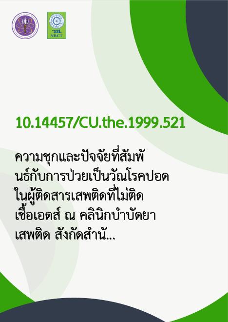 ความชุกและปัจจัยที่สัมพันธ์กับการป่วยเป็นวัณโรคปอด ในผู้ติดสารเสพติดที่ไม่ติดเชื้อเอดส์ ณ คลินิกบำบัดยาเสพติด สังกัดสำนักอนามัย กรุงเทพมหานคร |