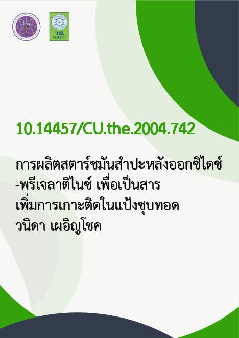 | Title | การผลิตสตาร์ชมันสำปะหลังออกซิไดซ์-พรีเจลาติไนซ์ เพื่อเป็นสารเพิ่มการเกาะติดในแป้งชุบทอด / |