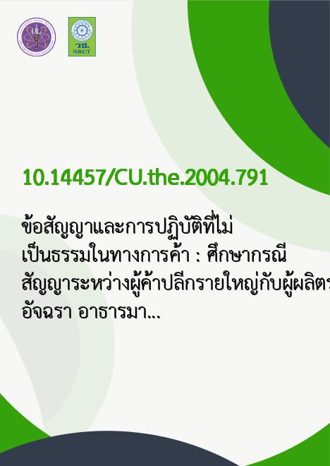 | Title | ข้อสัญญาและการปฏิบัติที่ไม่เป็นธรรมในทางการค้า : ศึกษากรณี สัญญาระหว่างผู้ค้าปลีกรายใหญ่กับผู้ผลิตรายย่อย / |