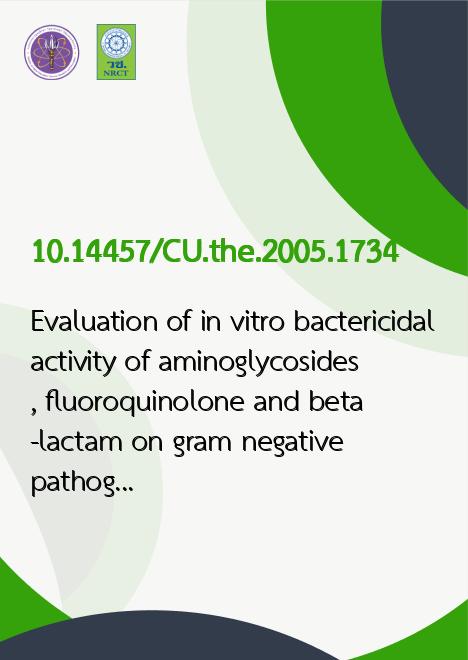 Abstract In present, we should have failure on treatment bacteria infection, however, there should have the appropriate treatment. The purposes of this study were to evaluate the bactericidal activity and to study kinetics of killing of aminoglycoside, fluorquinolone and beta-lactam antibiotics against common gram negative bacterial. The minor objectives were to determine the influence factors which altered bactericidal activity such as, inoculum effect. In this investigation, the six species of gram negative bacteria which were selected from the clinical isolates (E.coli, K.pneumoniae, P.mirabilis, Providencia spp., P.aeruginosa and A.buamannii) were randomized to the study. From the randomized, the microorganisms which E.coli, K.pneumoniae, P.mirabilis, Providencia spp., P.aeruginosa were senses to tested antimicrobial agents, but, Abuamannii was multi-resistance to most used antibiotics. There had used through the study. Bactericidal activity was tested bybroth macro dilution which to determine the MIC, MBC and the alter MIC when increse inoculum (inoculum effect). Time killing study in order to determine the bactericidal activity against selected bacteria which should be varied concentrations (sub-MIC, MIC, above MIC, trough, peak). From the study, it has been found that the antibiotics (gentamicin, amikacin, ofloxacin, ciprofloxacin, cefotaxime, amoxicillin/clavulanic acid, piperacillin/tazobactam, ampicillin/sulbactam, cefoperazone/sulbactam and imipenem) which used to against E.coli, should still bactericidal activity (MIC/MBC ranging in 1 to 4) and should have inoculum effect to beta-lactam antibiotics (cefotaxime, ampicillin/sulbactam, and cefoperazone/sulbactam). The 99.9% killing to E.coli without regrowth in the first 2 hr, should be found in aminoglycosides and fluoroquinolone which there could start to kill in the concentration at MIC. But beta-lactam should be found the 99.9% killing to E.coli without regrowth in the 6[superscript th] hr. which could start to kill in the concentration at 4MIC. For K.pneumoniae, the antibiotics (gentamicin, amikacin, ciprofloxacin, cefotaxime, piperacillin/tazobactam, and imipenem) which used to against K.pneumoniae, should still bactericidal activity (MIC/MBC ranging in 1 to 4) and should not have inoculum effect. The 99.9% killing to K.pneumoniae without regrowth in the first 2 hr, should be found in aminoglycosides and imipenem which there could start to kill in the concentration at 4MIC. But beta-lactam and ciprofloxacin should be found the 99.9% killing to K.pneumoniae without regrowth in the 6[superscript th]. which could start to kill in the concentration at 4MIC. In P.mirabilis, the antibiotics (amikacin, netilmicin, ciprofloxacin, cefotaxime, piperacillin/tazobactam, and imipenem) which used to against P.mirabilis should still bactericidal activity (MIC/MBC ranging in 1 to 4) and should have inoculum effect to cefotaxime and imipenem. And the 99.9% killing to P.mirabilis without regrowth in the first 2 hr. should be found in aminoglycosides which there could start to kill in the concentration at 4MIC. But beta-lactam and ciprofloxacin should be found the 99.9% killing to P.mirabilis without regrowth in the 6[superscript th] hr. which could start to kill in the concentration at 4MIC. For Providencia spp., all antibiotics (amikacin, netilmicin, ciprofloxacin, cefotaxime, and imipenem) which used to against Providencia spp. should still bactericidal activity (MIC/MBC ranging in 1 to 4) and should have inoculum effect to imipenem. And the 99.9% killing to Providencia spp. without regrowth in the first 2 hr, should be found in aminoglycosides ciprofloxacin and imipenem which there could start to kill in the concentration at 4MIC. But cefotaxime should be found the 99.9% killing to Providencia spp. without regrowth in the 6[superscript th] hr. which could start to kill in the concentration at 8MIC. For P.aeruginosa all antibiotics (amikacin, netilmicin, ciprofloxacin, ceftazidime, piperacillin/tazobactam and imipenem)which used to against P.aeruginosa should still bactericidal activity (MIC/MBC ranging in 1 to 4) except for imipenem and should have inoculum effect to piperacillin/tazobactam and imipenem. And the 99.9% killing to P.aeruginosa without regrowth in the first 2 hr, should be found in aminoglycosides ciprofloxacin which there could start to kill in the concentration at 8MIC. But beta-lactam should be found the 99.9% killing to P.aeruginosa without regrowth in the 6[superscript th] hr. which could start to kill in the concentration at 8MIC. For A.buamannii should have resist to the antibiotics (amikacin, netilmicin, ciprofloxacin, ceftazidime, ampicillin/sulbactam, cefoperazone/sulbactam and imipenem) which used to against A.buamannii, and no inoculum effect. The 8MIC, the peak, and the peak high dose were the concentration which could kill 99.9% of A.buamannii but there were high concentration to apply in clinical used.