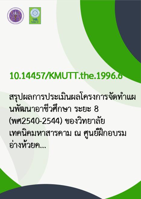 | Title | สรุปผลการประเมินผลโครงการจัดทำแผนพัฒนาอาชีวศึกษา ระยะ 8 (พ.ศ.2540-2544) ของวิทยาลัยเทคนิคมหาสารคาม ณ ศูนย์ฝึกอบรมอ่างห้วยค้อ อำเภอนาเชือก จังหวัดมหาสารคาม ประจำปีการศึกษา 2539 / |