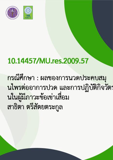 กรณีศึกษา : ผลของการนวดประคบสมุนไพรต่ออาการปวด และการปฏิบัติกิจวัตรประจำวันในผู้มีภาวะข้อเข่าเสื่อม /สาธิตา ตรีสัตยตระกูล |