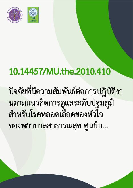ปัจจัยที่มีความสัมพันธ์ต่อการปฏิบัติงานตามแนวคิดการดูแลระดับปฐมภูมิ สำหรับโรคหลอดเลือดของหัวใจ ของพยาบาลสาธารณสุข ศูนย์บริการสาธารณสุข กรุงเทพมหานคร /สุดฤทัย เรืองฤทธิ์